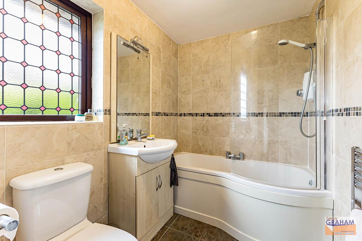 White suite. Panelled shower bath. Shower screen. Aqualisa power shower. Vanity unit with wash hand basin and mono style mixer tap. Close couple low flush wc. Travertine effect tiled walls. Ceramic tiled floor. Chrome finish heated towel rail Hotpress.