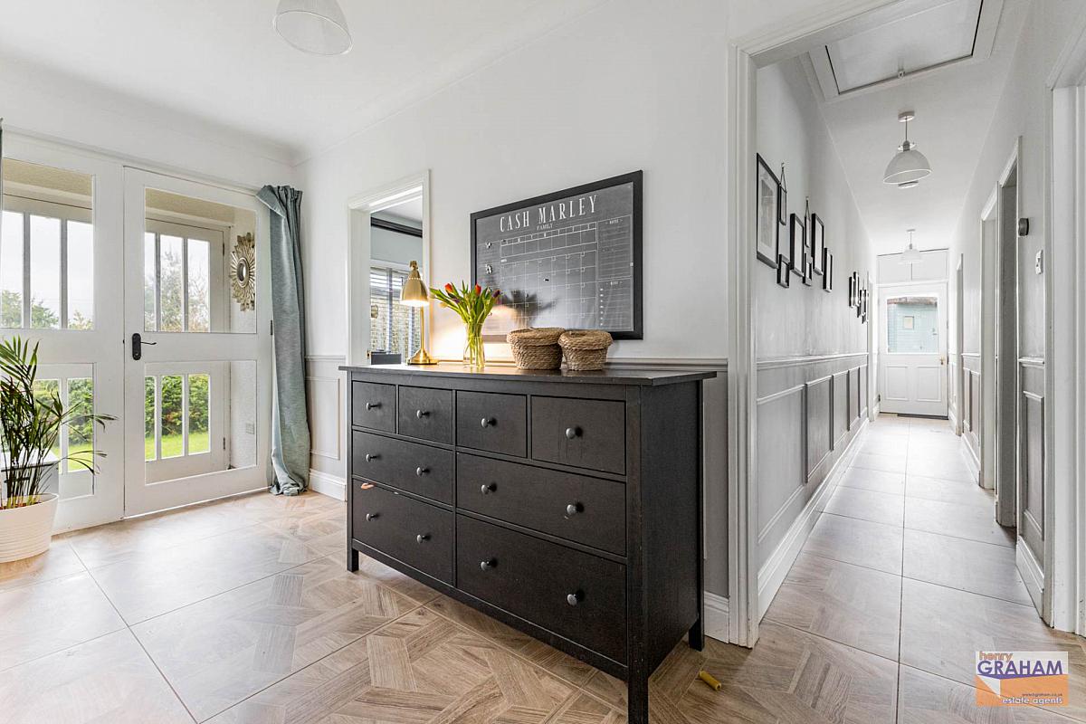 Glazed entrance door with glazed side panel. Tiled floor. Large storage cupboard with light. Double glazed door to driveway. Access to roofspace.