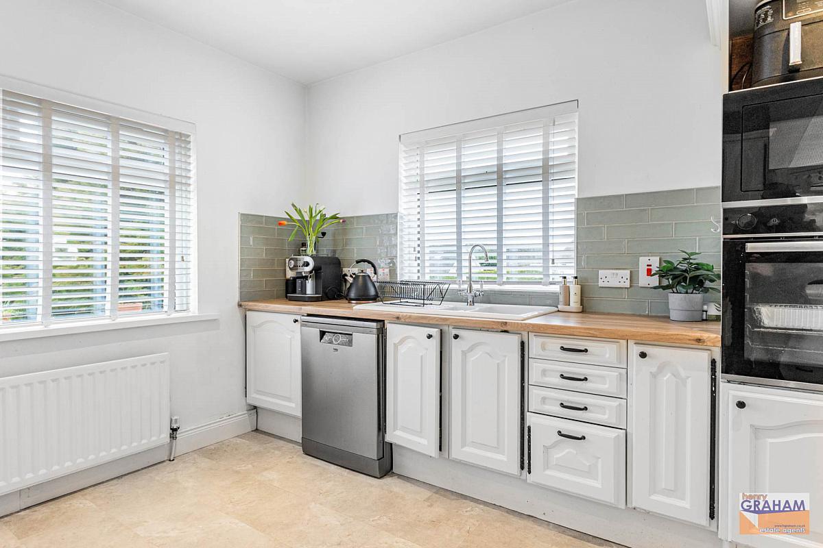 High and low level units. Granite effect round edge work surface. Stainless steel sink unit with mono style mixer tap. Plumbed for washing machine. Firebird condensing type oil fired boiler. Laminated tiled floor.