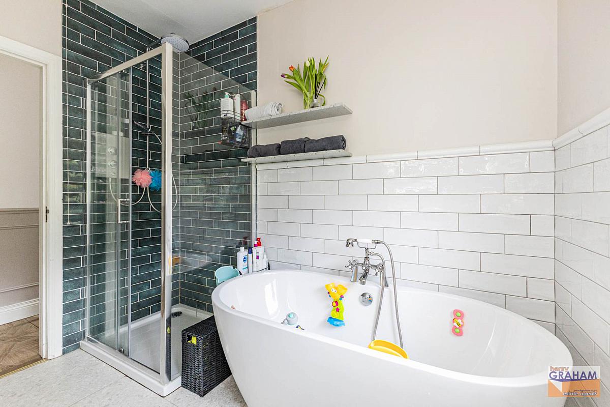 Bathroom With White Suite Including Shower Cubicle And Freestanding Bath Tub