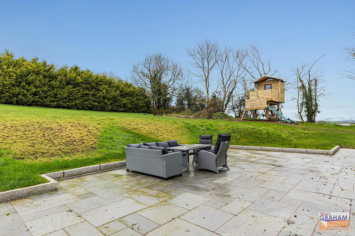Spacious front and side garden laid in lawn with mature trees and shrubbery. Concrete area to entrance door. Driveway with gated entrance. Rear paved patio area. Extensive raised rear garden laid in lawn. Outside tap and light. PVC oil storage tank. Raised parking area. Garden shed. Large paddock area to rear accessed via gate from the rear garden.