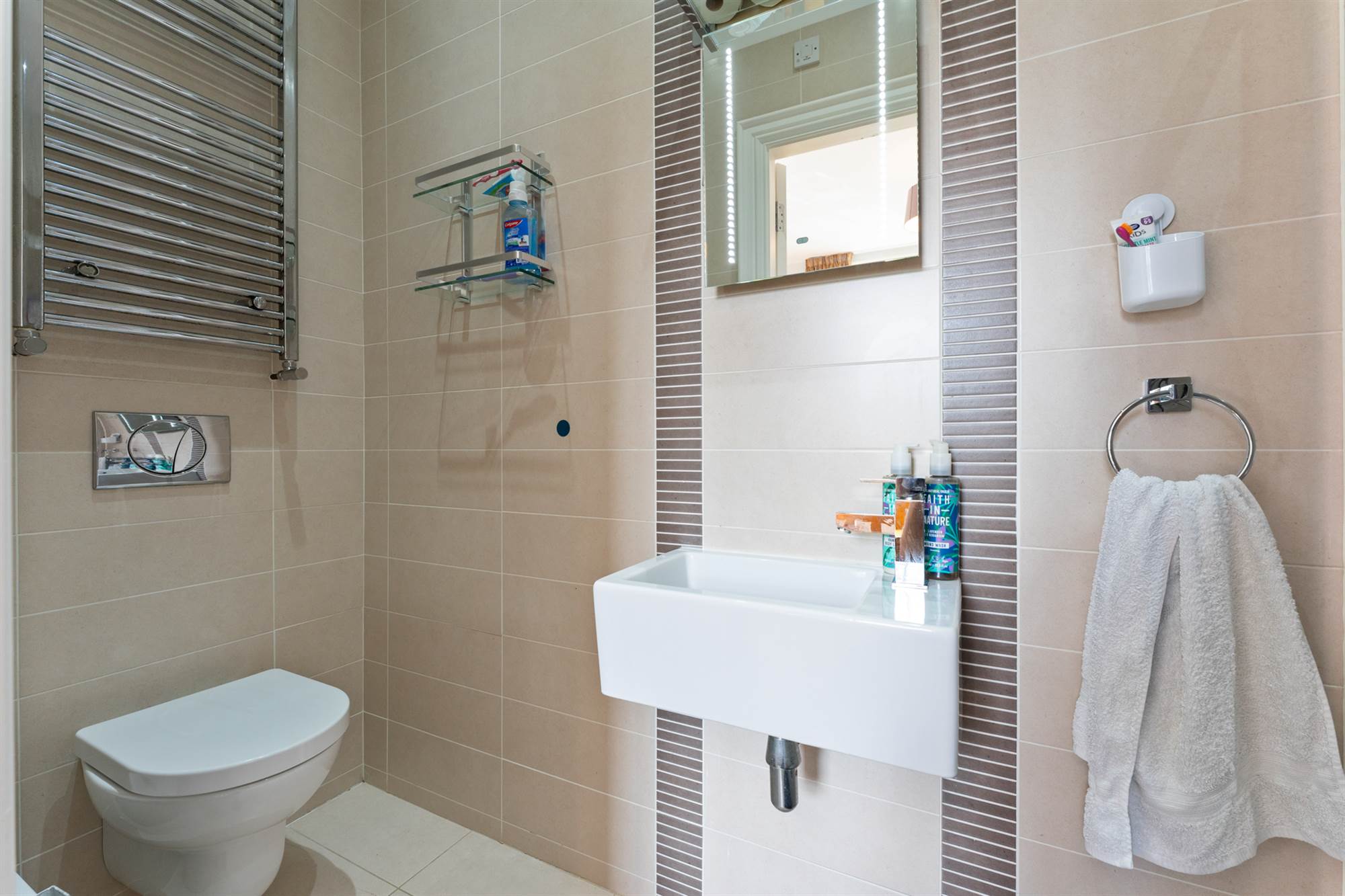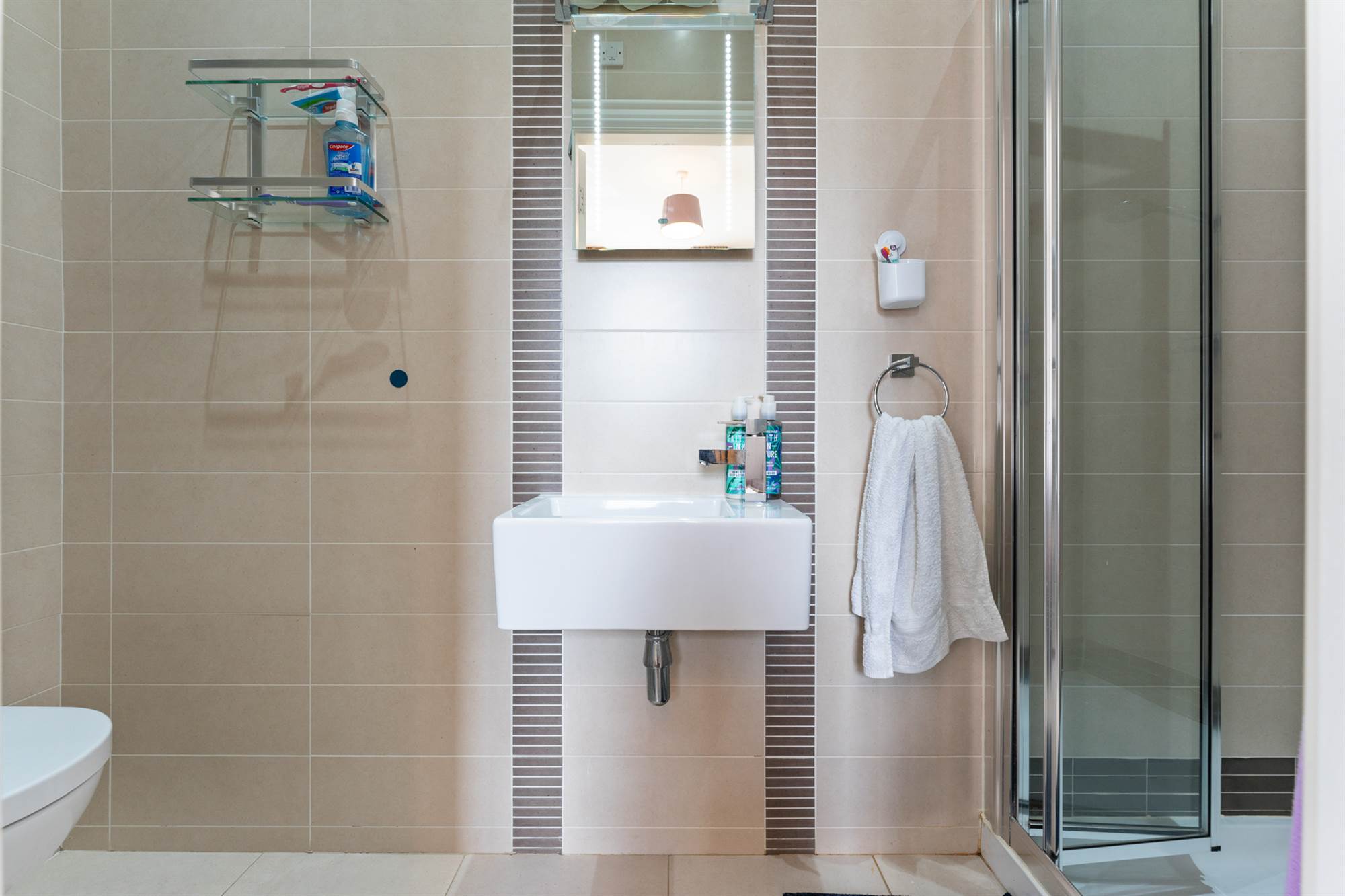 Fully Tiled Shower Enclosure, low flush W, pedestal wash hand basin