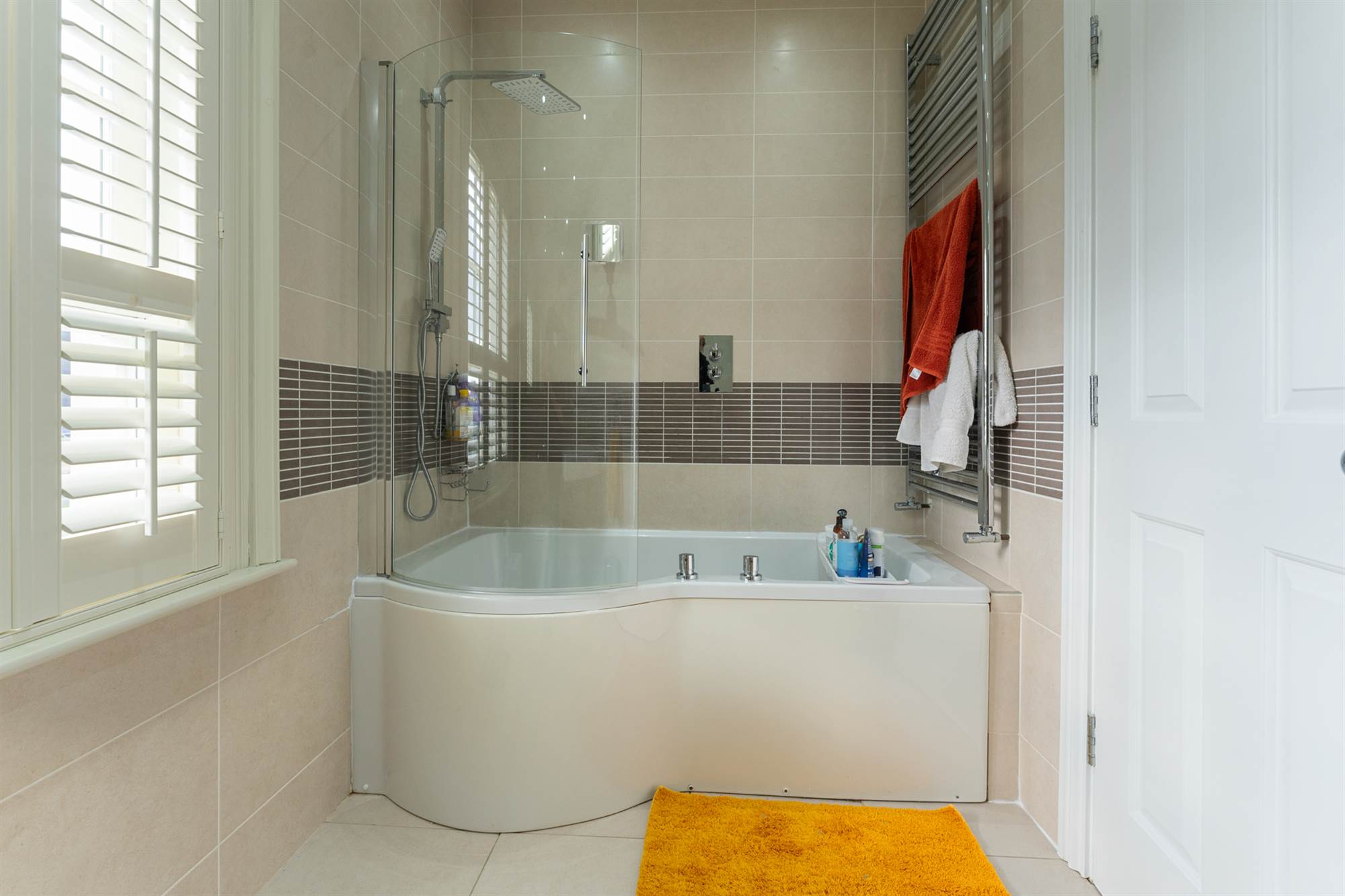 White suite, panelled bath, mixer taps, overhead shower, telephone hand shower, low flush WC, pedestal wash hand basin