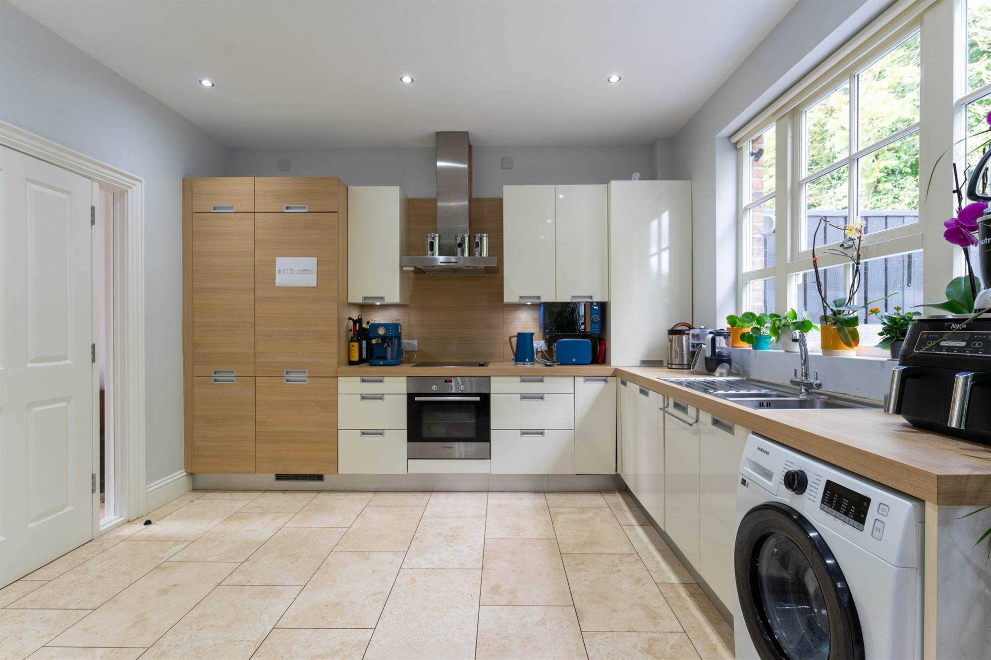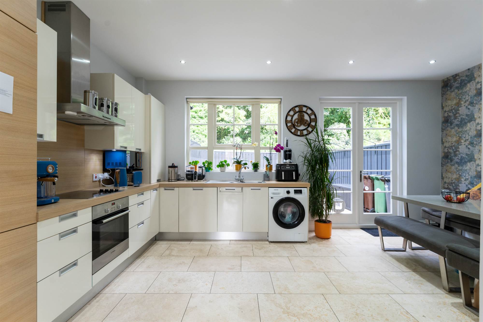 Kitchen - High and low level units, inset sink, 4 ring hob, electric oven, integrated fridge freezer, dishwasher and washing machine, double doors to rear garden
