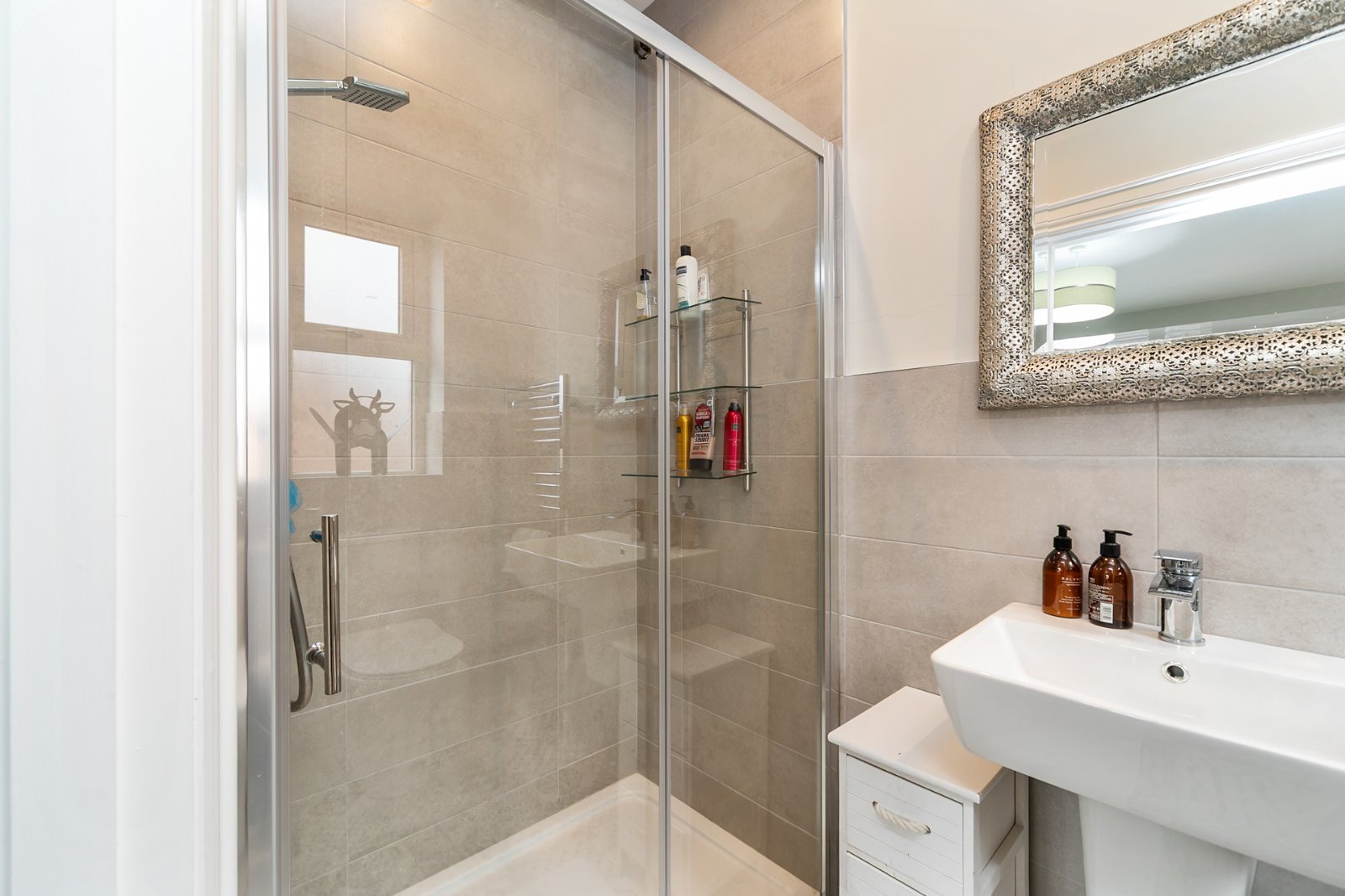 Fully tiled, low flush WC, pedestal wash hand basin with vanity unit, chrome heated towel rail, fully tiled shower cubicle with rainhead shower, spotlighting