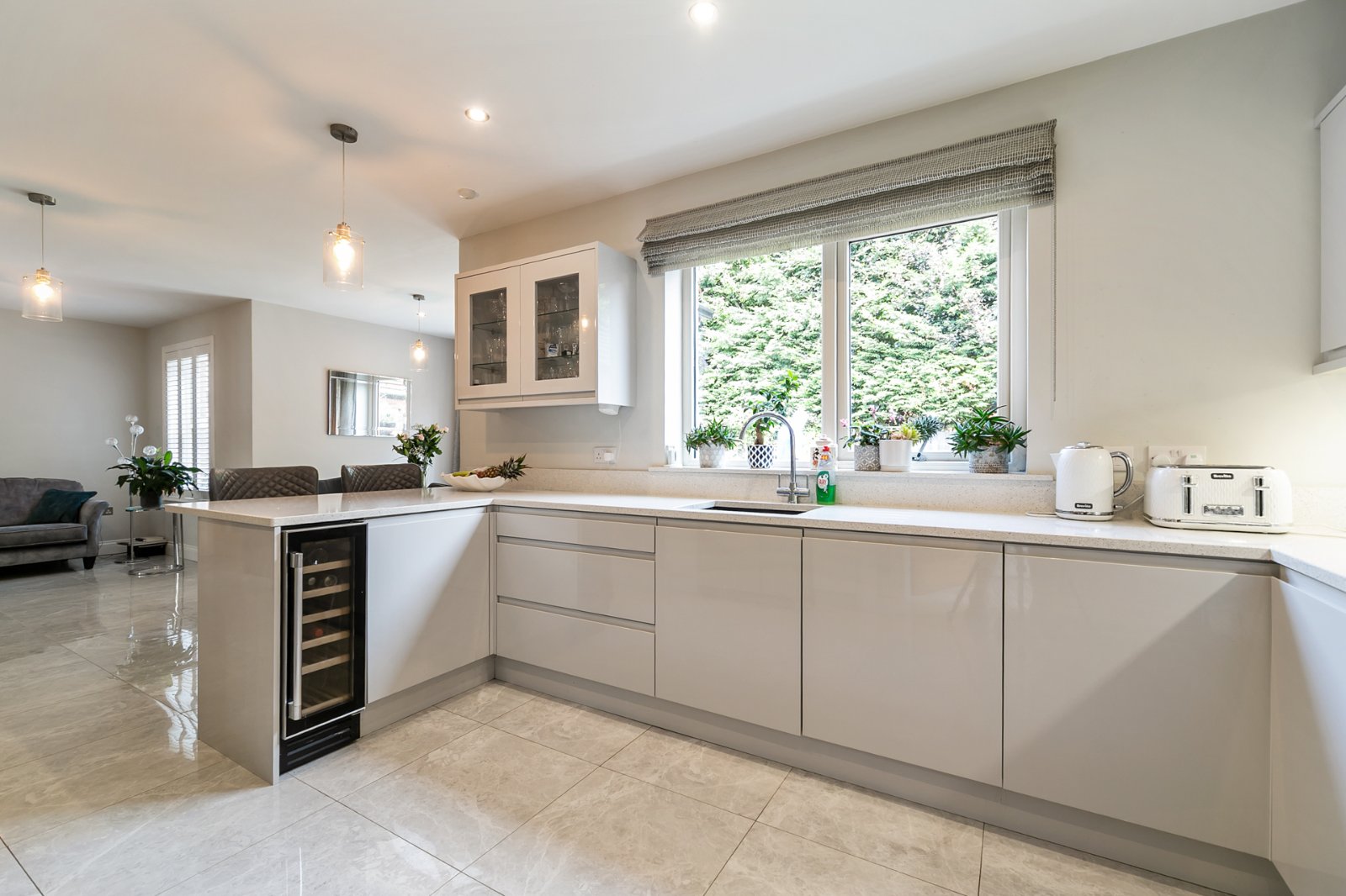Spotlighting, tiled floor, range of high and low units, 1.5 inset composite sink with mixer taps, quartz worktops, 5 ring gas hob, glass and stainless steel extractor fan. Double electric oven, integrated dishwasher, pull out bin, space for American fridge freezer, space for wine fridge, double uPVC doors leading outside