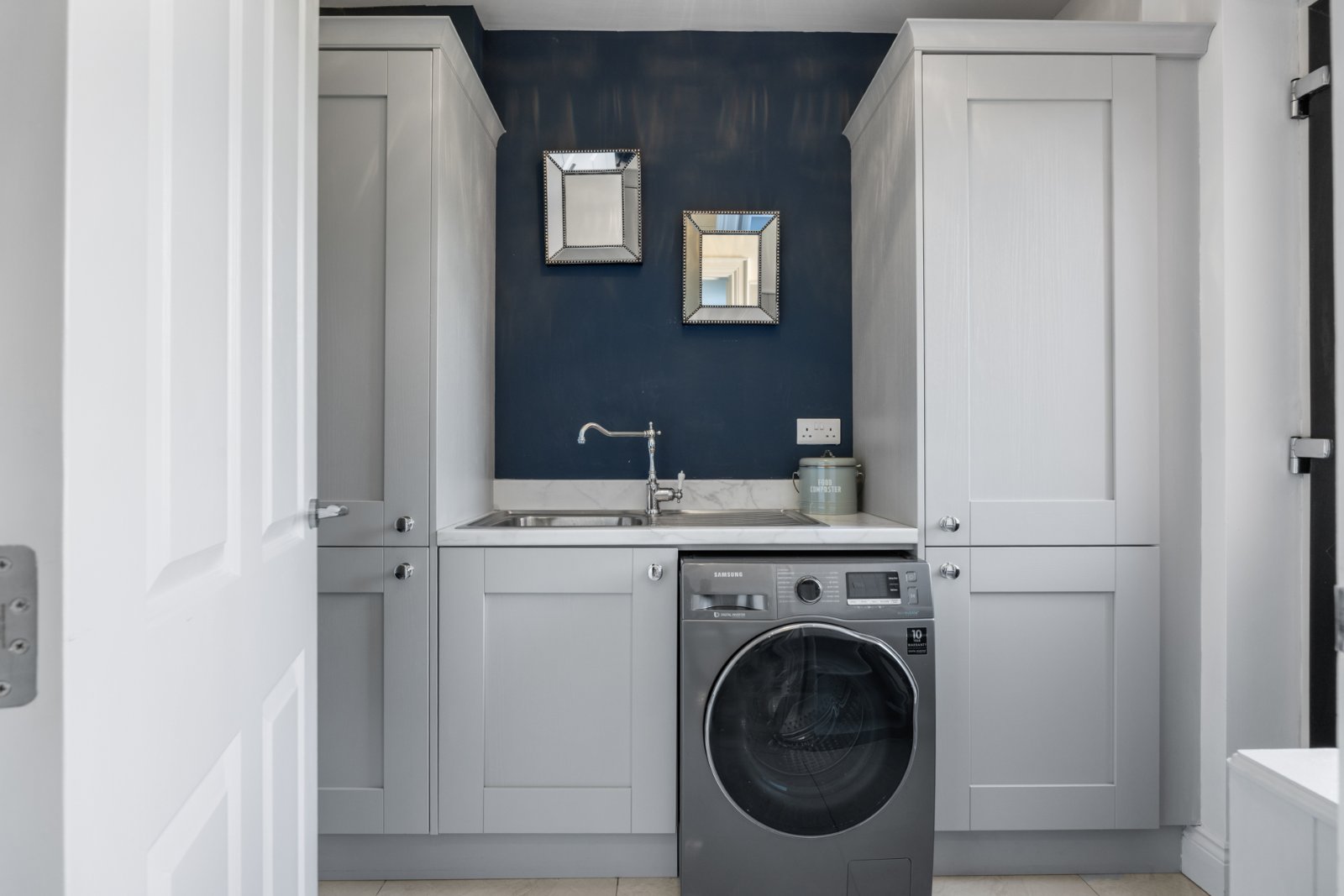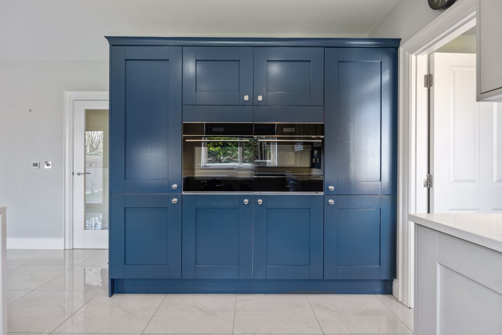Tiled floor, spotlighting, range of high and low level units, quartz worktops, inset sink, integrated dishwasher, wine fridge, ceramic hob, extractor fan, electric oven, integrated microwave, integrated fridge freezer