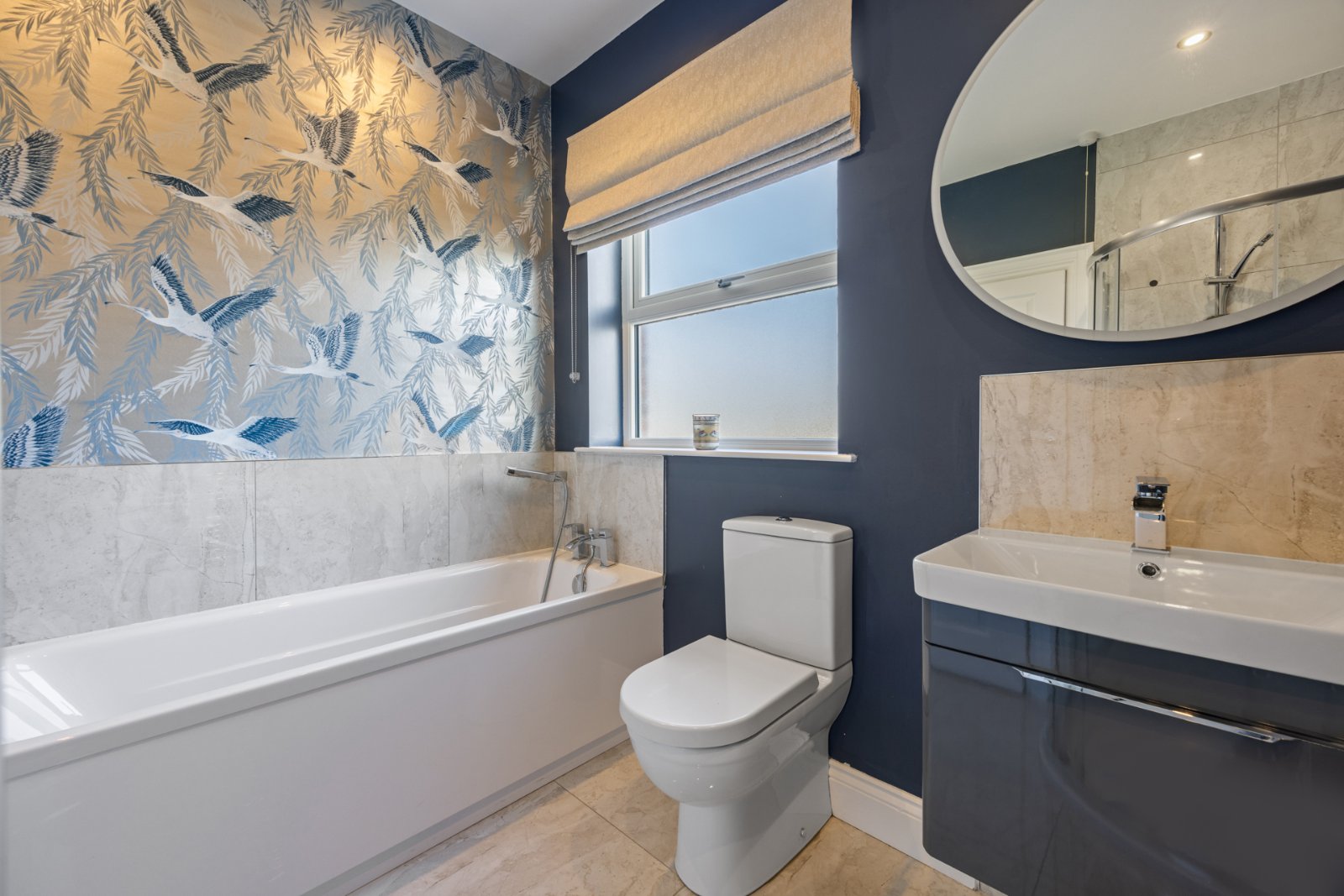 Tiled floor, chrome heated towel rail, low flush WC, pedestal wash hand basin, spotlighting, extractor fan, bath, fully tiled shower cubicle