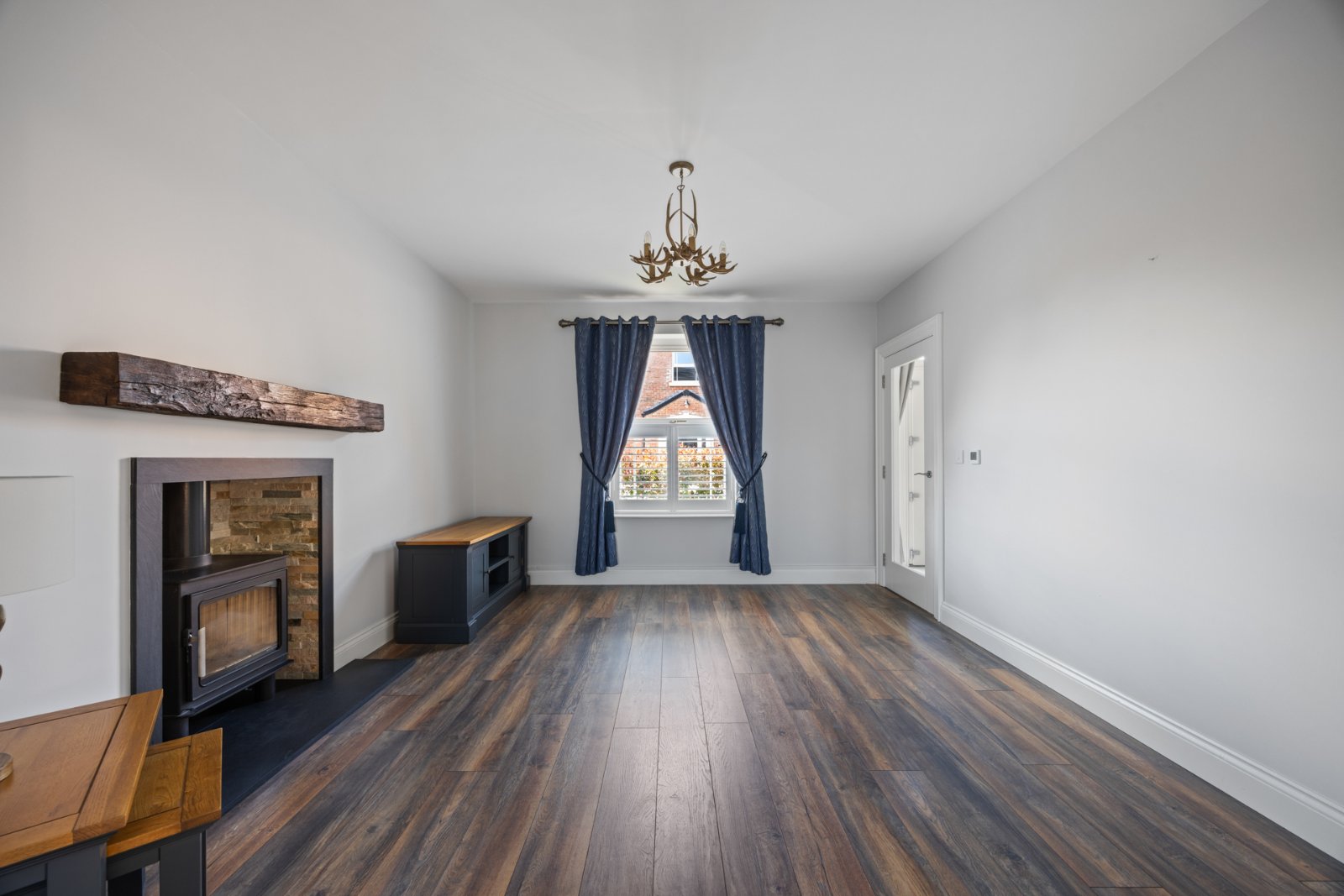 Laminate wood floor, wood burning stove, double doors to kitchen