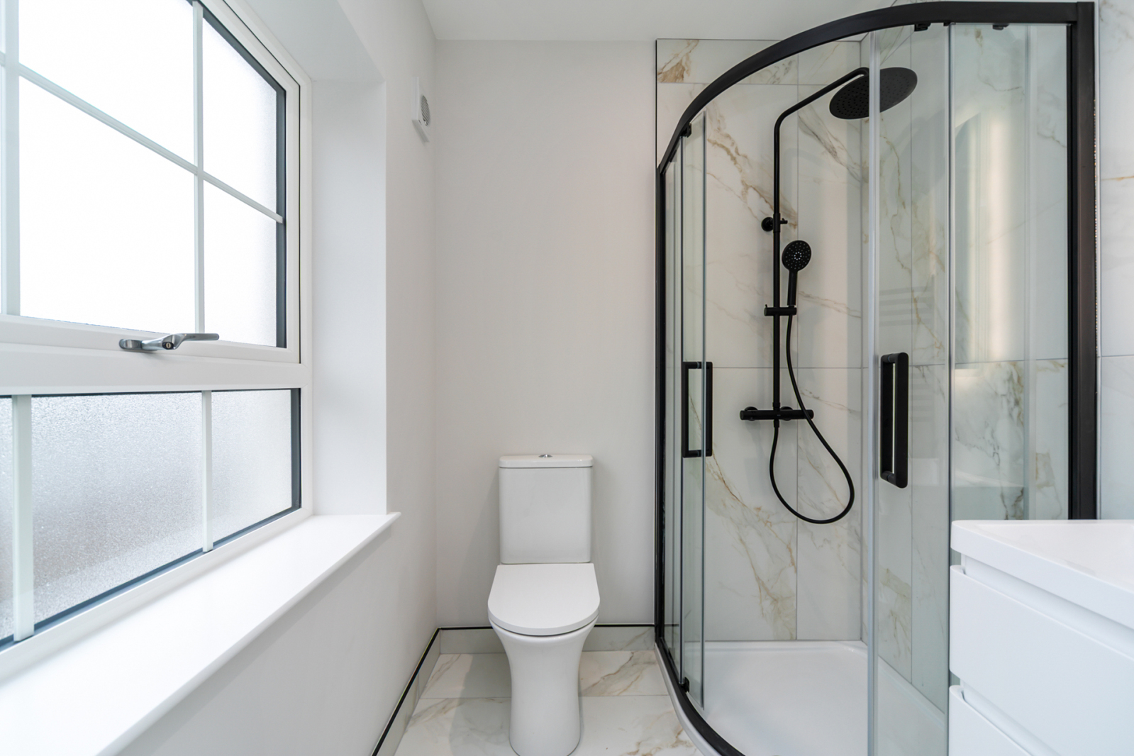 'Regen Marble' 1200 x 600mm tiles laid on floor and portrait stack to walls with light grey grout. Ryver black taps & trims and Grosvenor white wash hand basin.