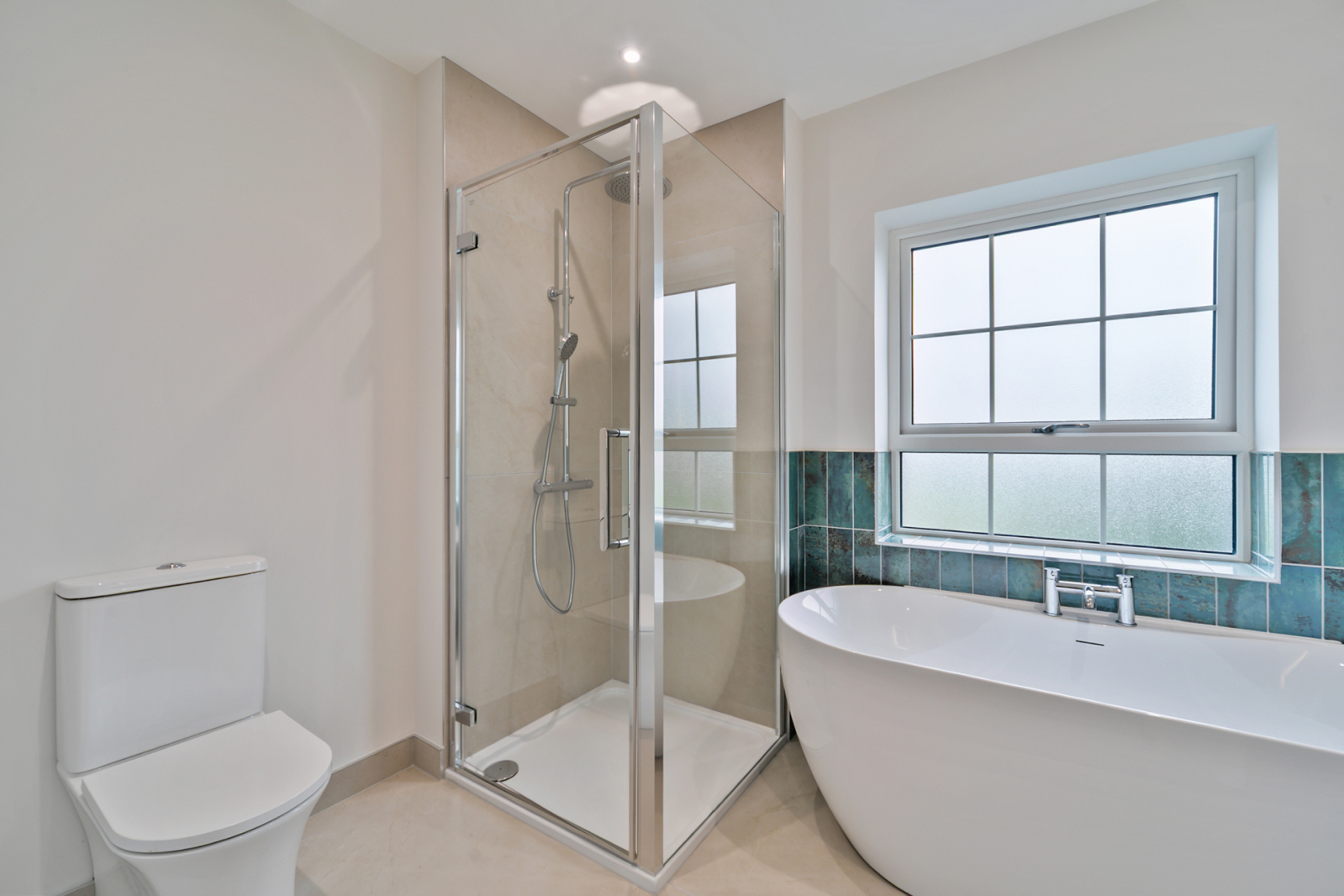Bro Bone 1000 x 1000 with light grey grout to match, Lux Smeraldo Tiles portraint stack on wall, Bro Bone 1000 x 1000 with light grey grout to match and Ryver black taps & trims and Grosvenor white wash hand basin and free standing bath.