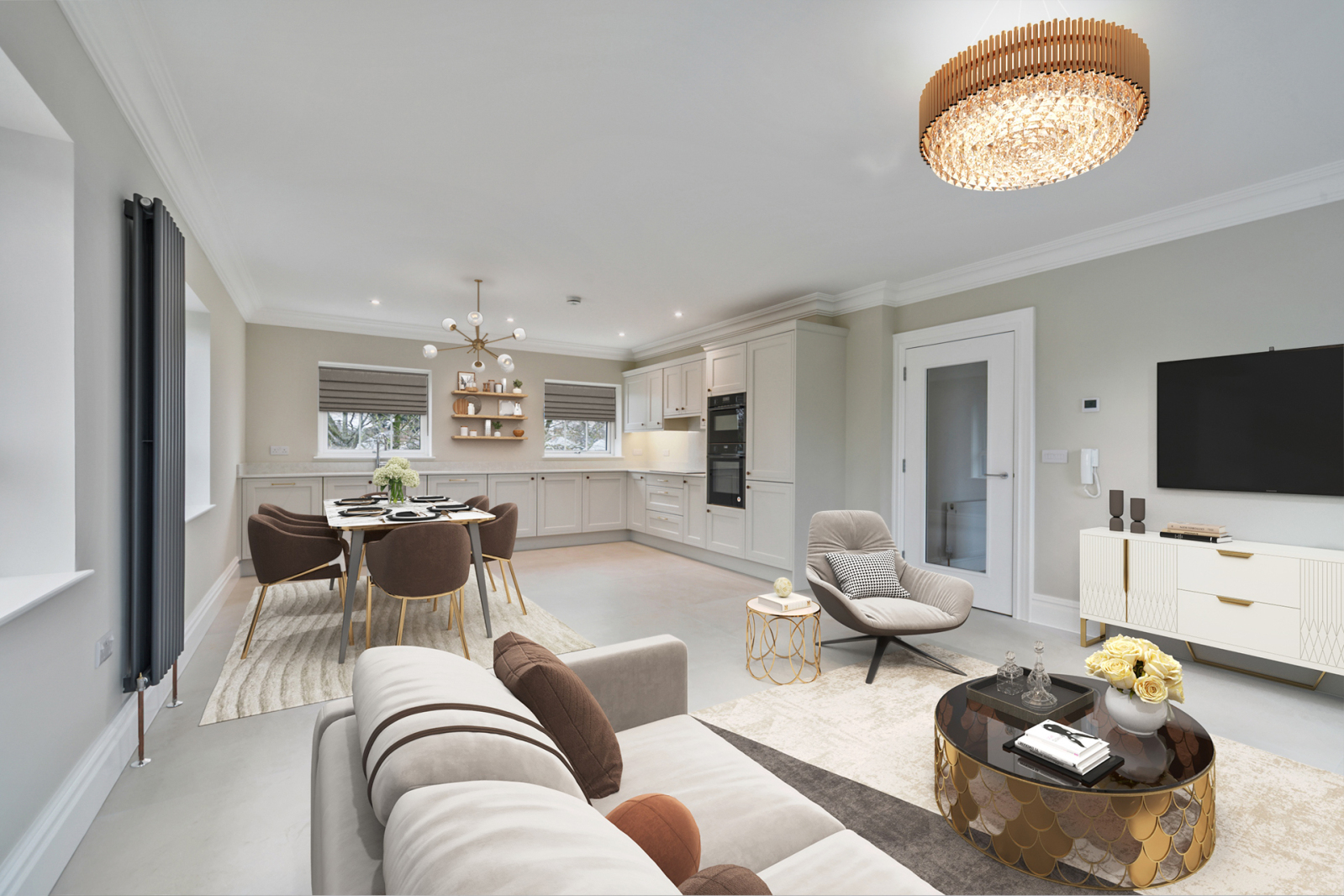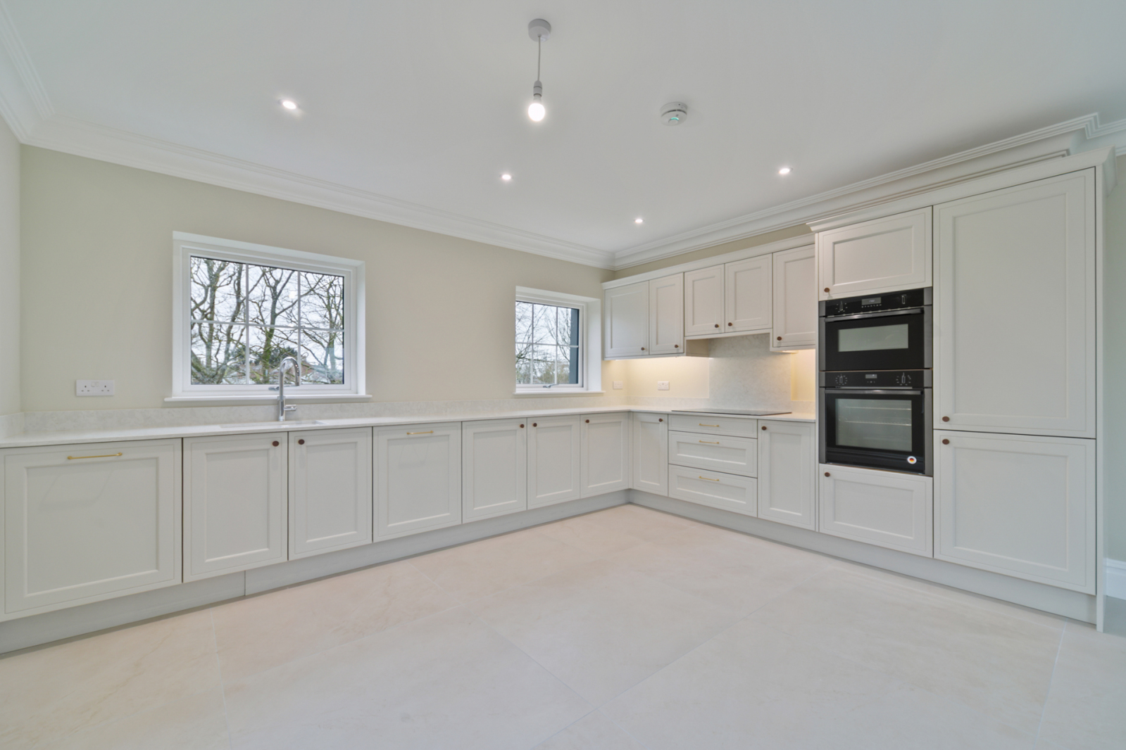 Bro Bone 1000 x 1000 Tile with light grey grout, Lusso Quartz Worktop with Full splashback at Hob, Winslow (Mock Inframe) in Shell colour, K1-203 Gold Bar Handles. Chrome Quooker Tap, White Composite Bowl & Half Sink. Johnsons 'Shaded White No. 201', Coving throughout Kitchen, Living & Dining