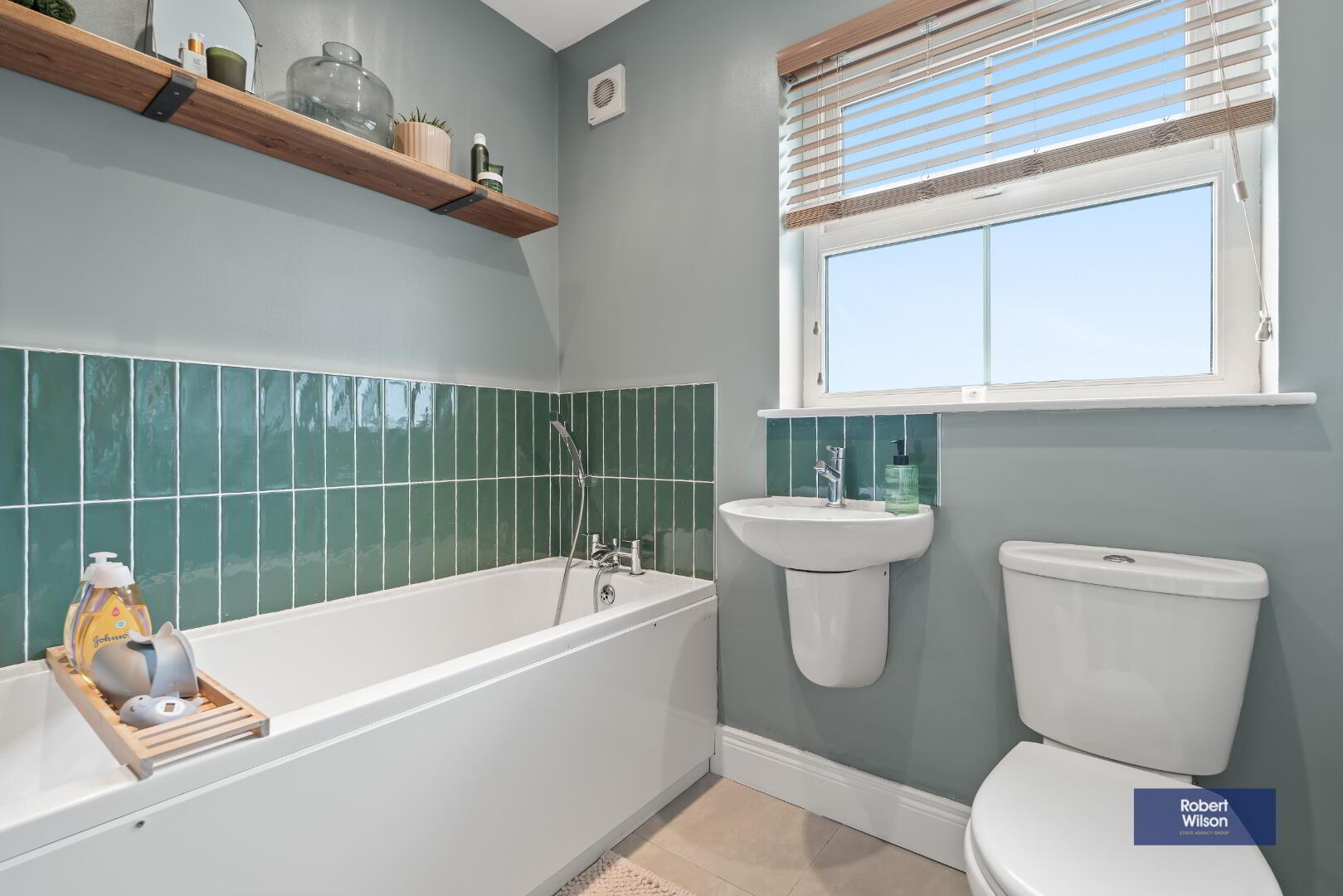 White suite comprising; low flush w.c., wall mounted wash hand basin, panel bathtub, chrome heated towel rail, part tiled walls, tiled floor and extractor fan.