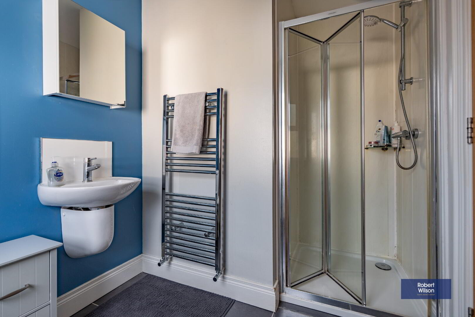 White suite comprising; low flush w.c., wall mounted wash hand basin, walk in shower cubicle with thermostatic valve, chrome heated towel rail, part tiled walls, tiled floor