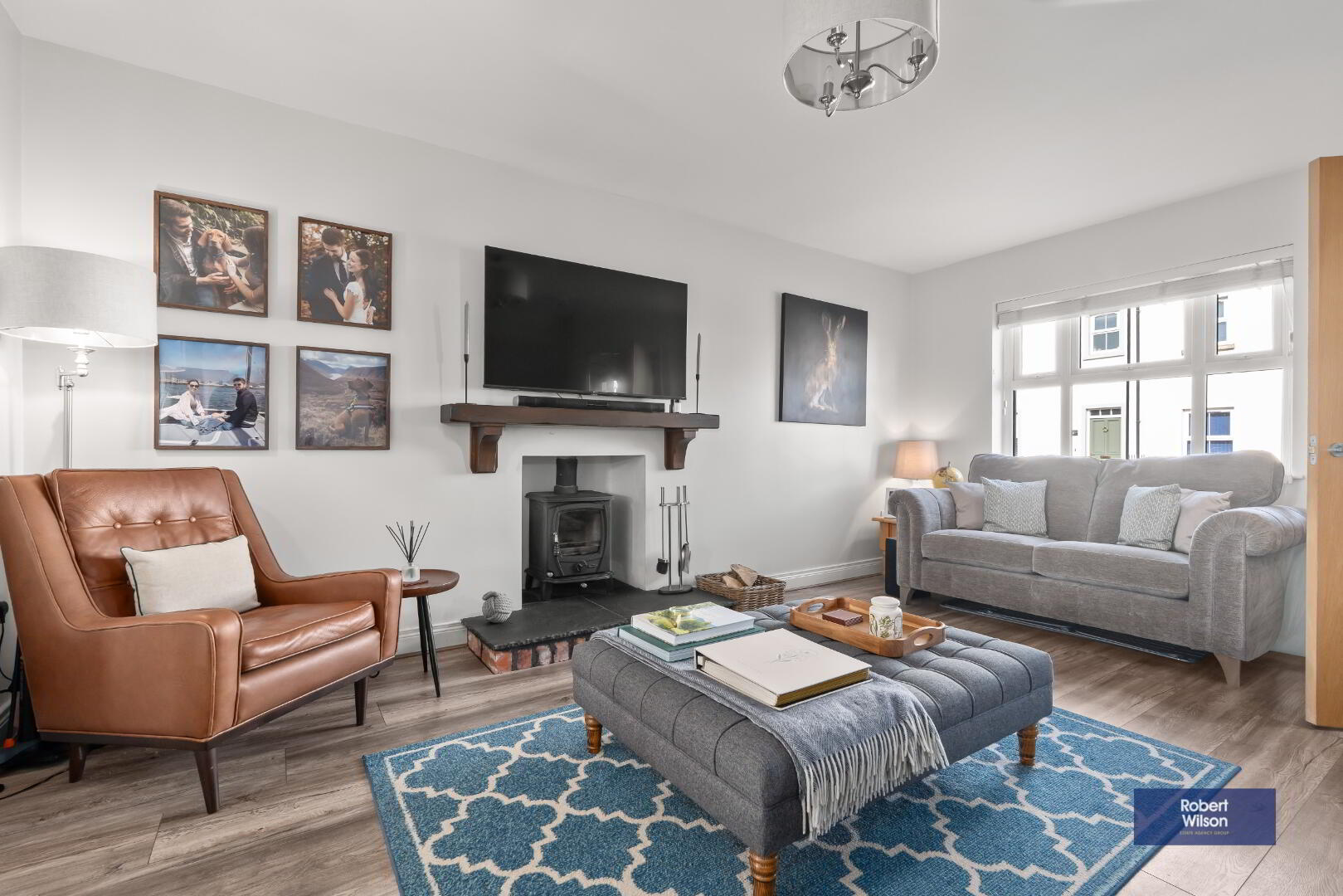 This attractive home welcomes you with a bright entrance hall featuring a hardwood front door and tiled flooring, setting the tone for the well-presented interiors throughout. The spacious lounge is a standout feature, complete with a charming wood-burning stove, slate hearth, and wooden mantle-ideal for cosy evenings-while French doors lead seamlessly into the open plan kitchen and dining area.