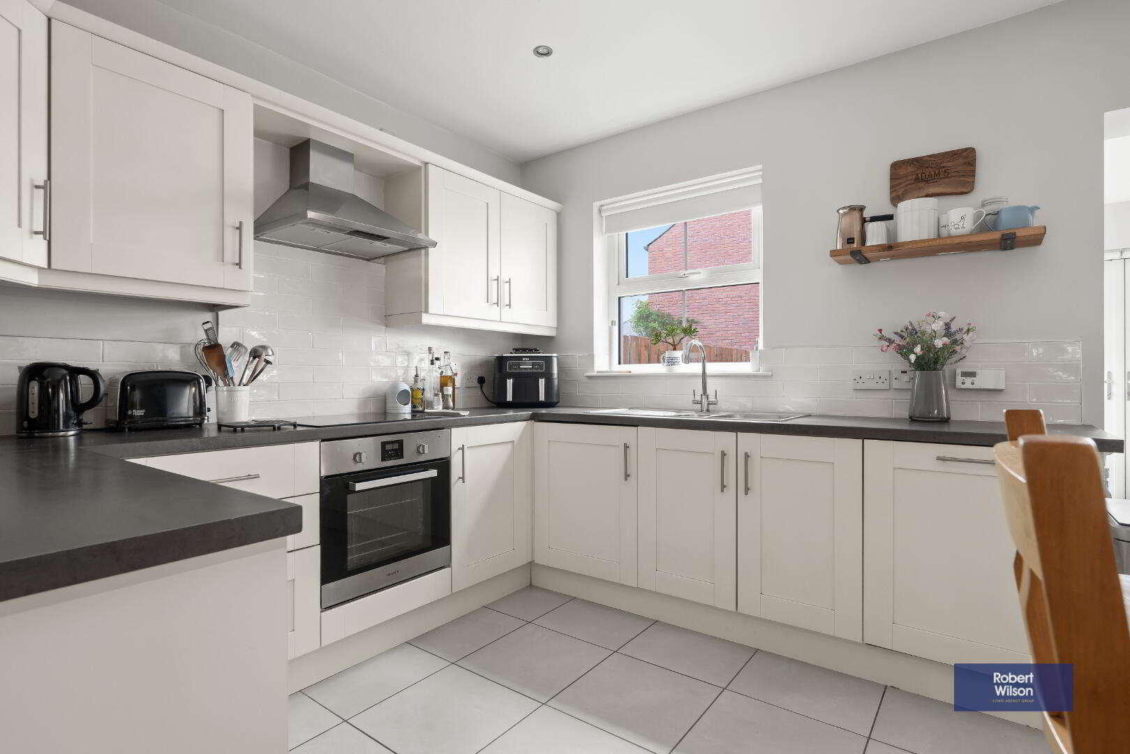 4.20m x 5.20m (13' 9" x 17' 1") Good range of high and low level units with laminate worktop, 1 1/2 stainless steel sink unit, built in single oven with 4 ring ceramic hob and extractor over, integrated dishwasher, part tiled walls, tiled floor, recessed lighting and double panel radiator.
