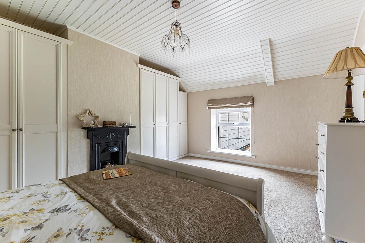 Range of built-in wardrobes. Wood panelled ceiling. Ornamental cast iron fireplace.