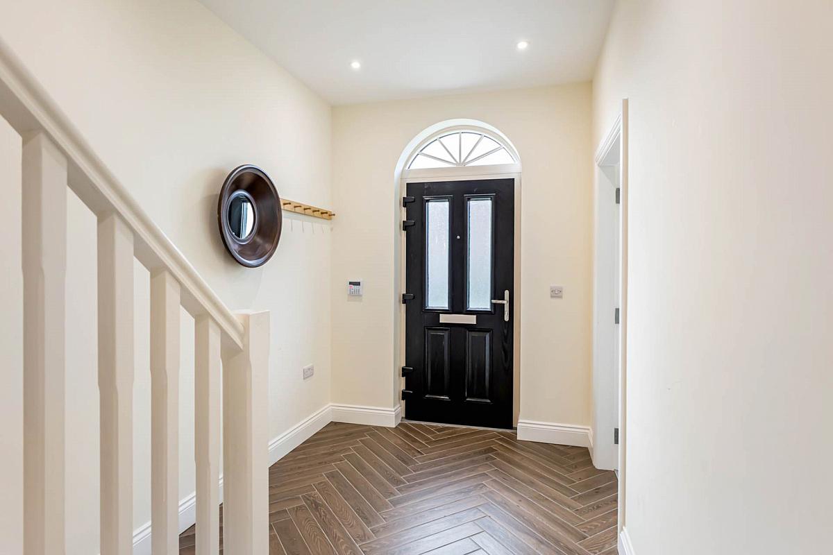 Part glazed composite front door with glazed fan light over. Herringbone style tiled floor. Understairs storage cupboard. Downlighters.