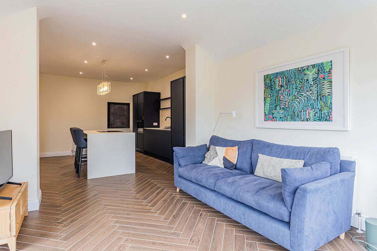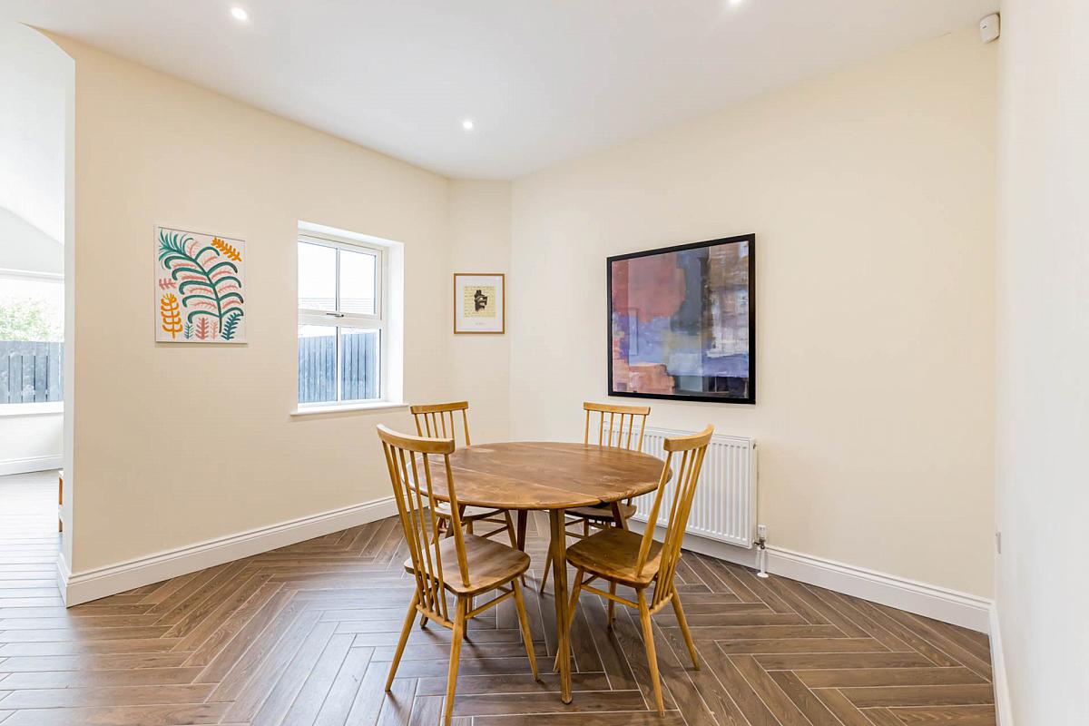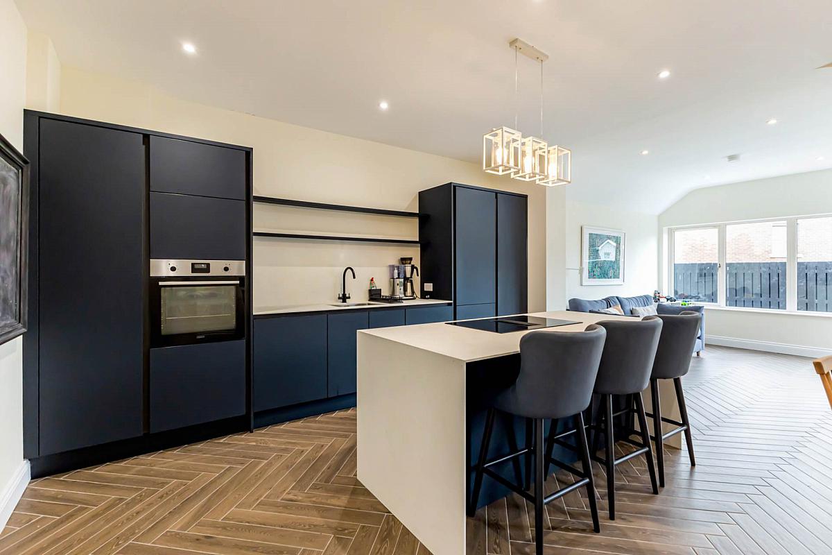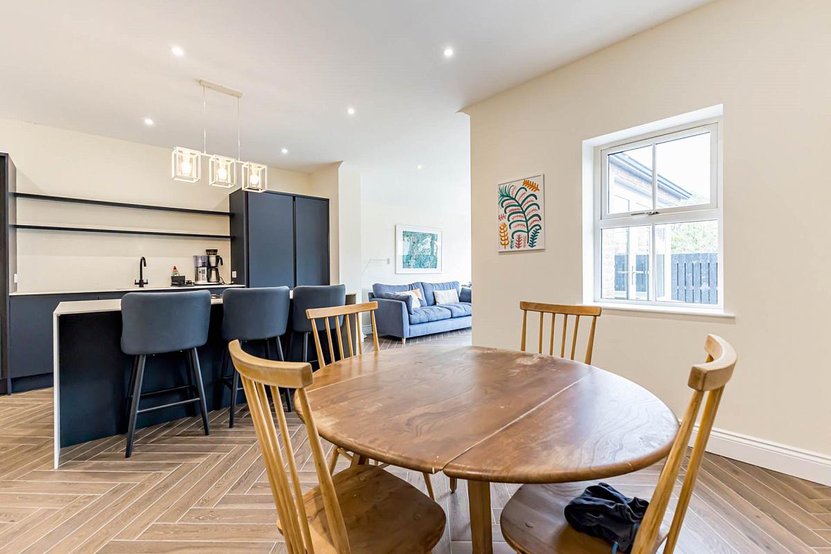 Range of modern high and low level units. Sink unit with mixer tap. Built-in oven. Integrated dishwasher. Integrated fridge freezer. Matching Island unit with 4 ring induction hob with integrated extractor unit, cupboards and drawers and breakfast bar. Herringbone style tiled floor. Downlighters.