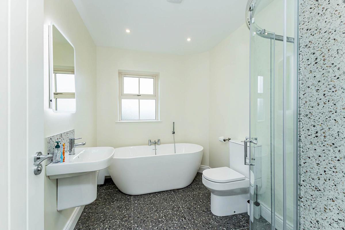 White suite to include free standing bath with central mixer tap and shower attachment; corner shower cubicle with drench head shower and separate hose attachment; floating wash hand basin with mixer tap; and w.c. Downlighters. Heated towel rail. Tiled floor.