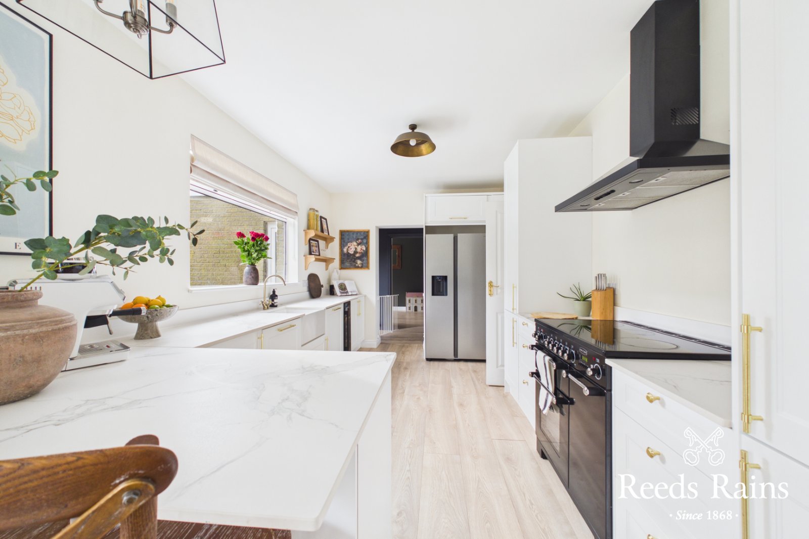 An impressive range of high and low level cabinets, Dekton work tops, Belfast sink unit, mixer tap, range cooker, integrated dishwasher, integrated fridge/ freezer, wooden flooring, open to dining area.