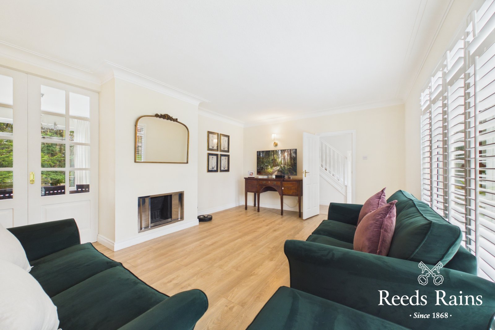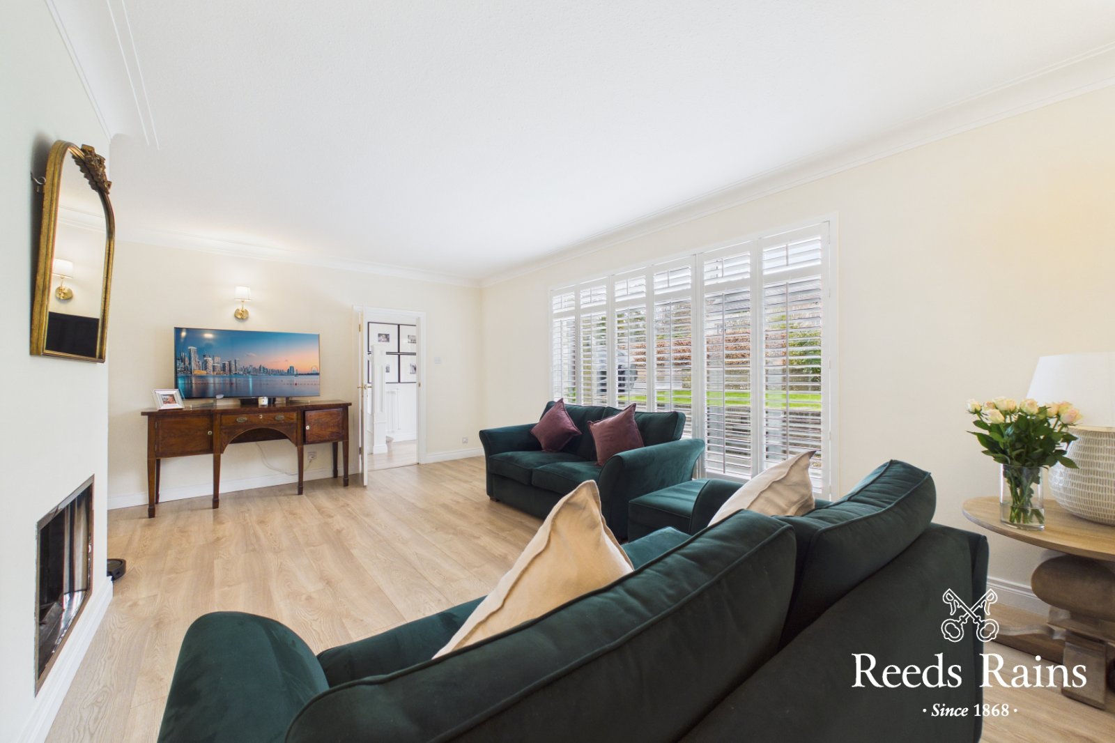 Feature fireplace, wooden flooring, wooden window shutters.