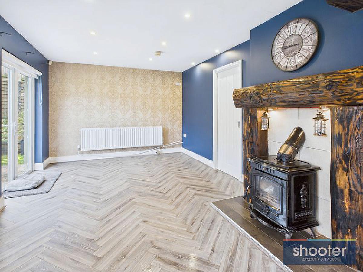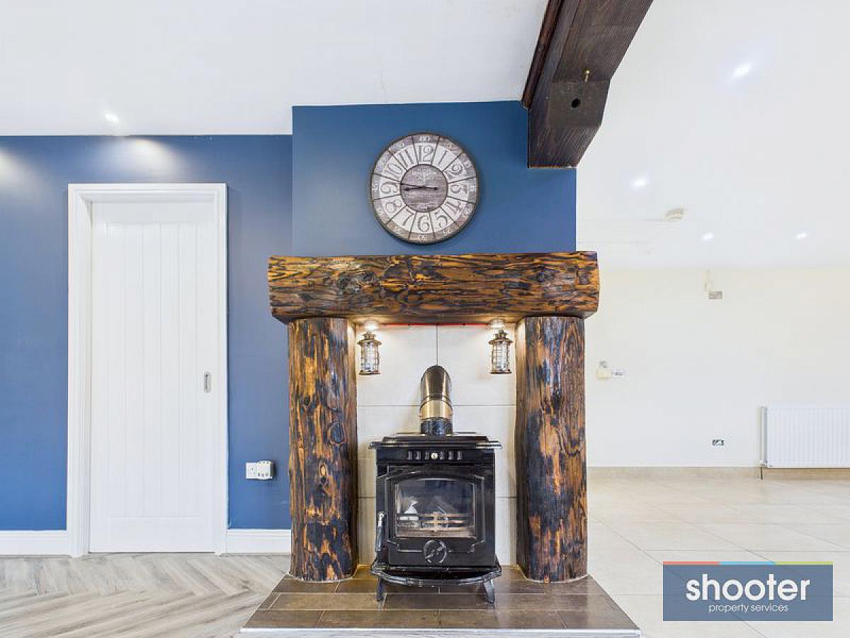 Feature timber beam. Cast iron stove with tile hearth, inset and timber mantle and surround. Laminate floor. PVC double French doors to side patio.
