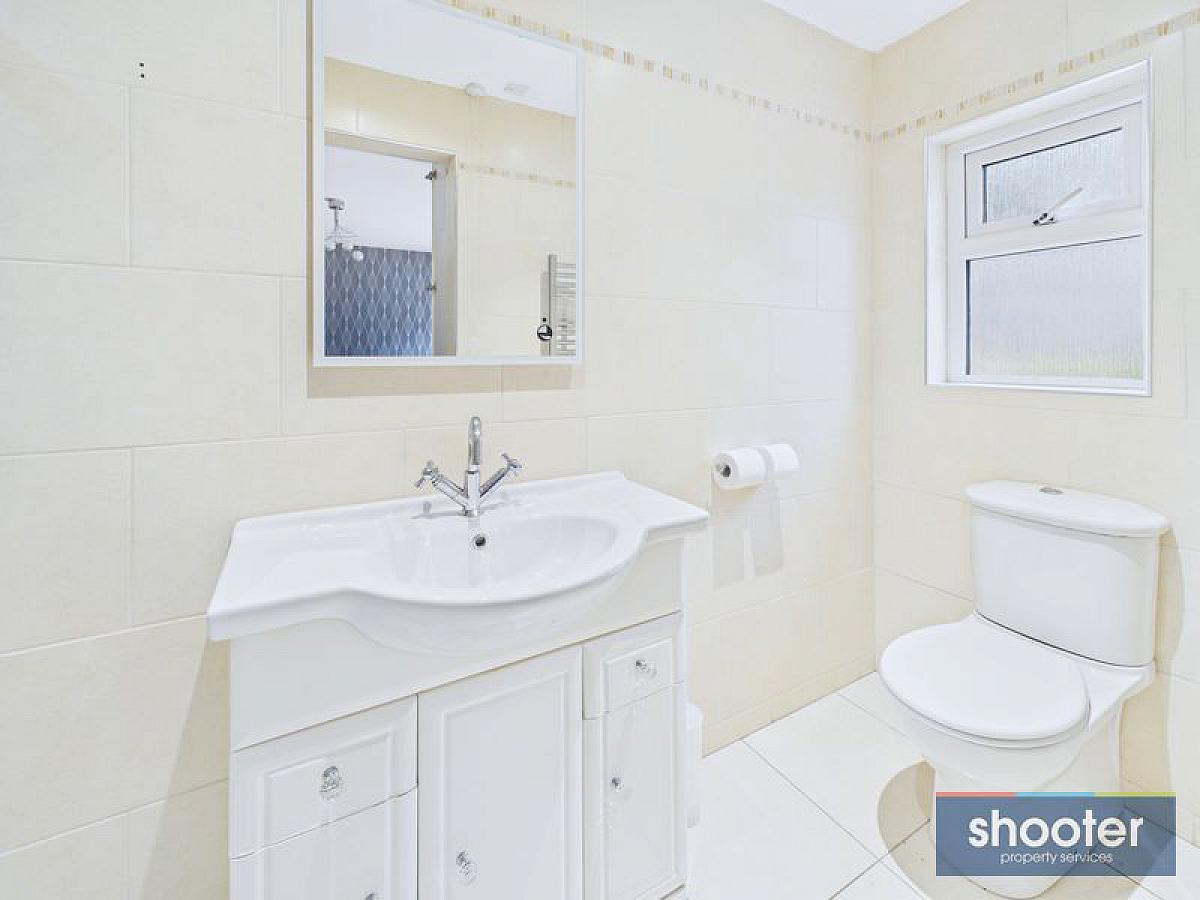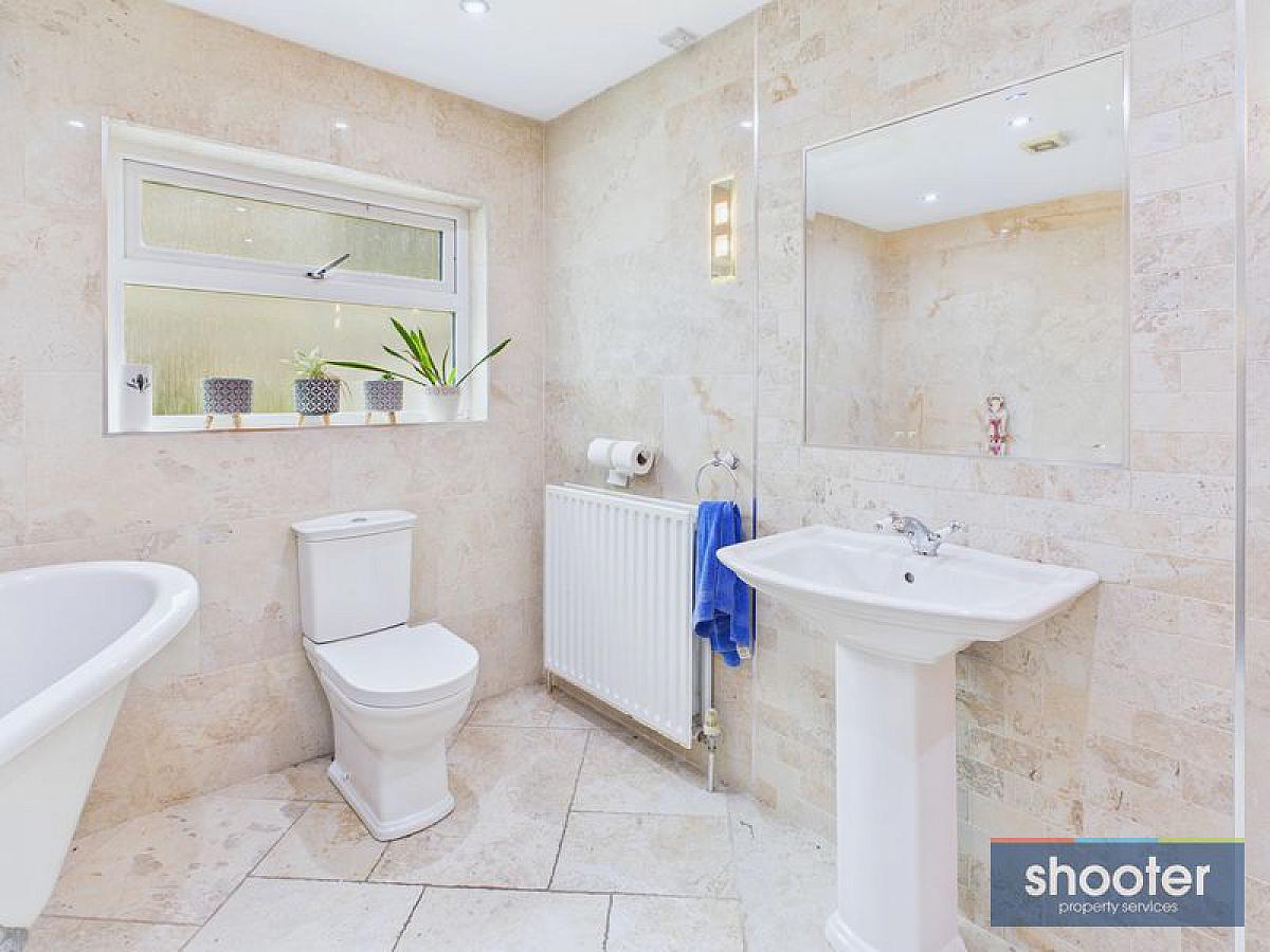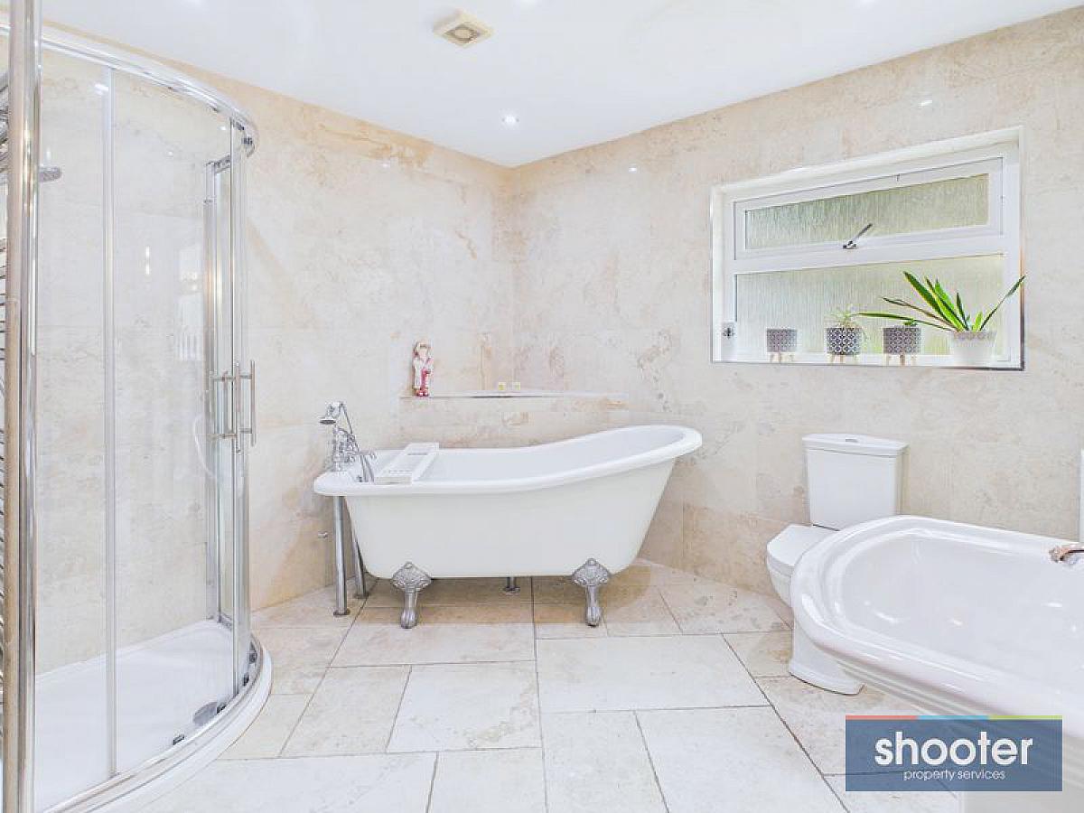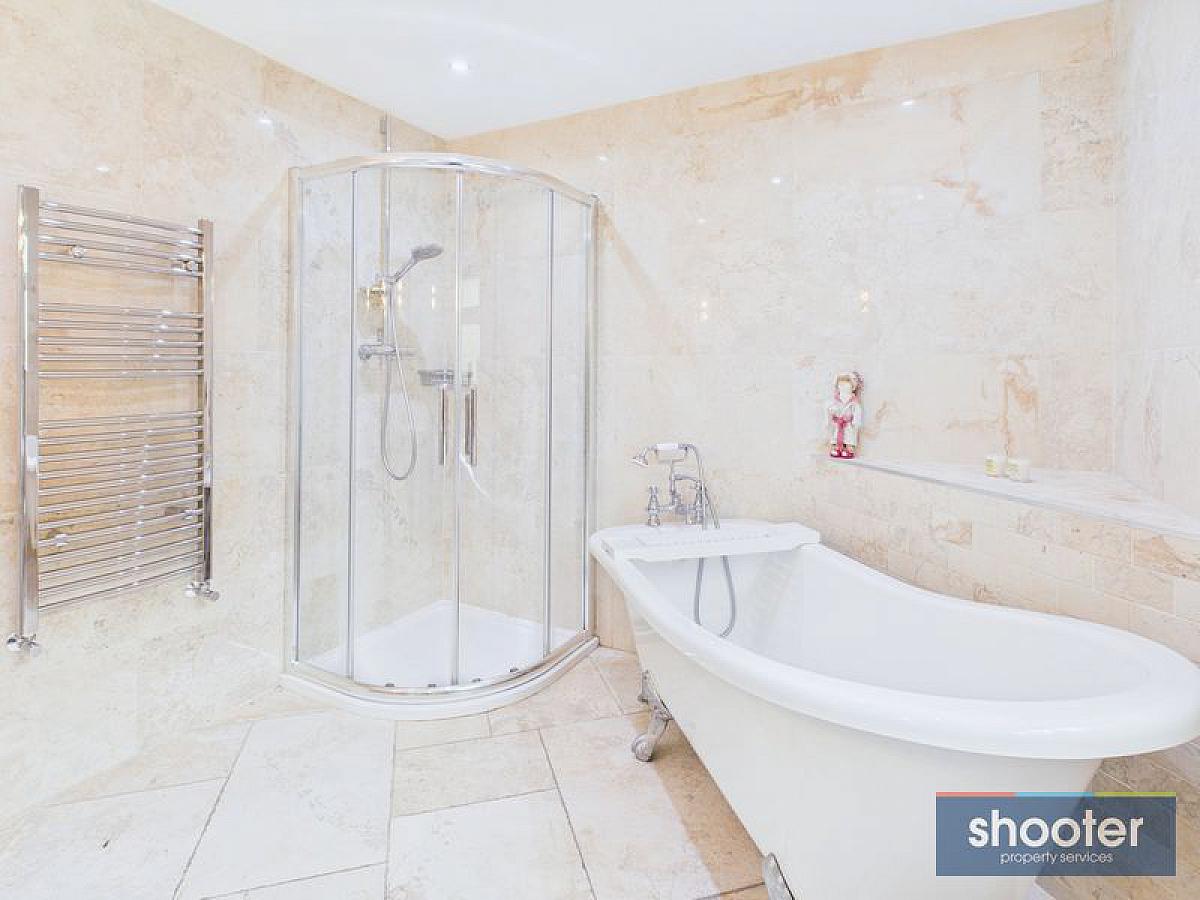 Free standing bath, toilet, pedestal wash hand basin and shower. Heated towel rail. Extractor fan and recessed ceiling lights. Ceramic tiled floor and walls.