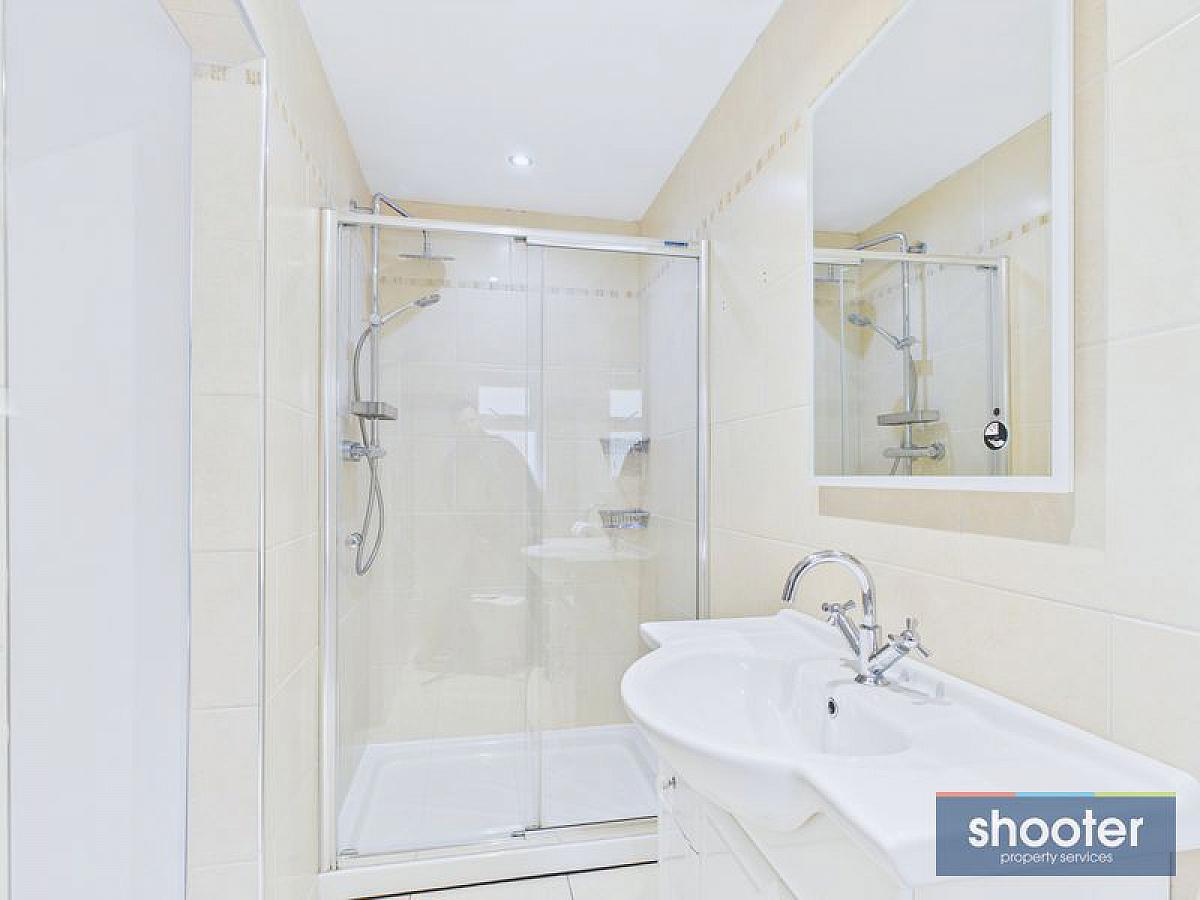 Toilet, vanity wash hand basin, enclosed shower with sliding door. Heated towel rail and extractor fan. Recessed ceiling lights. Ceramic tiled floor and walls.
