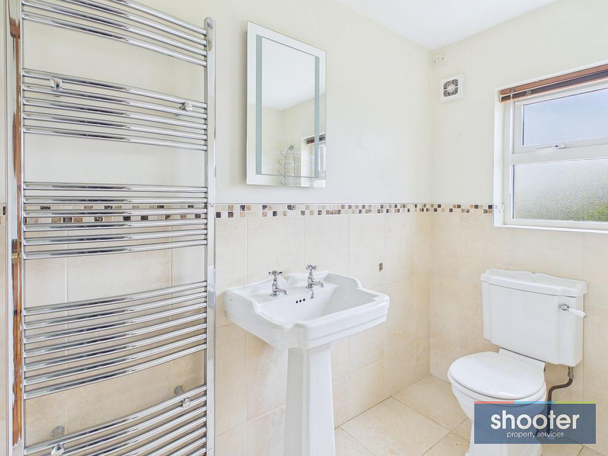 Toilet, pedestal wash hand basin, shower cubicle with Redring Glow electric shower unit. LED mirror, heated towel rail and extractor fan. Ceramic tile floor and part tiled walls.