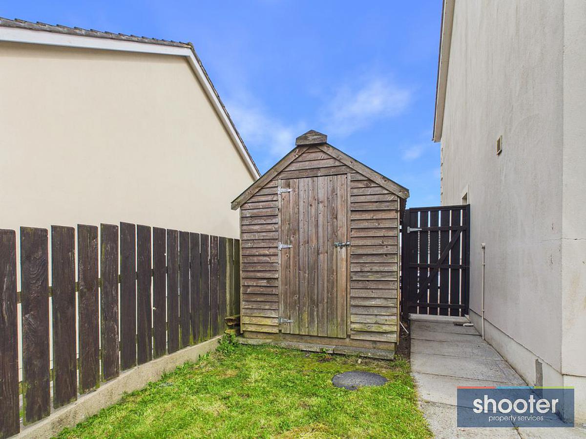 Brick paved driveway with parking to side. Grass lawn. Outside light and post box. Gated side entrance. Enclosed rear garden with grass lawn, paved patio area and garden shed. Washing line, water tap and outside light.