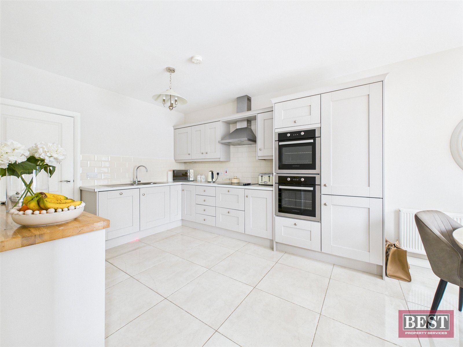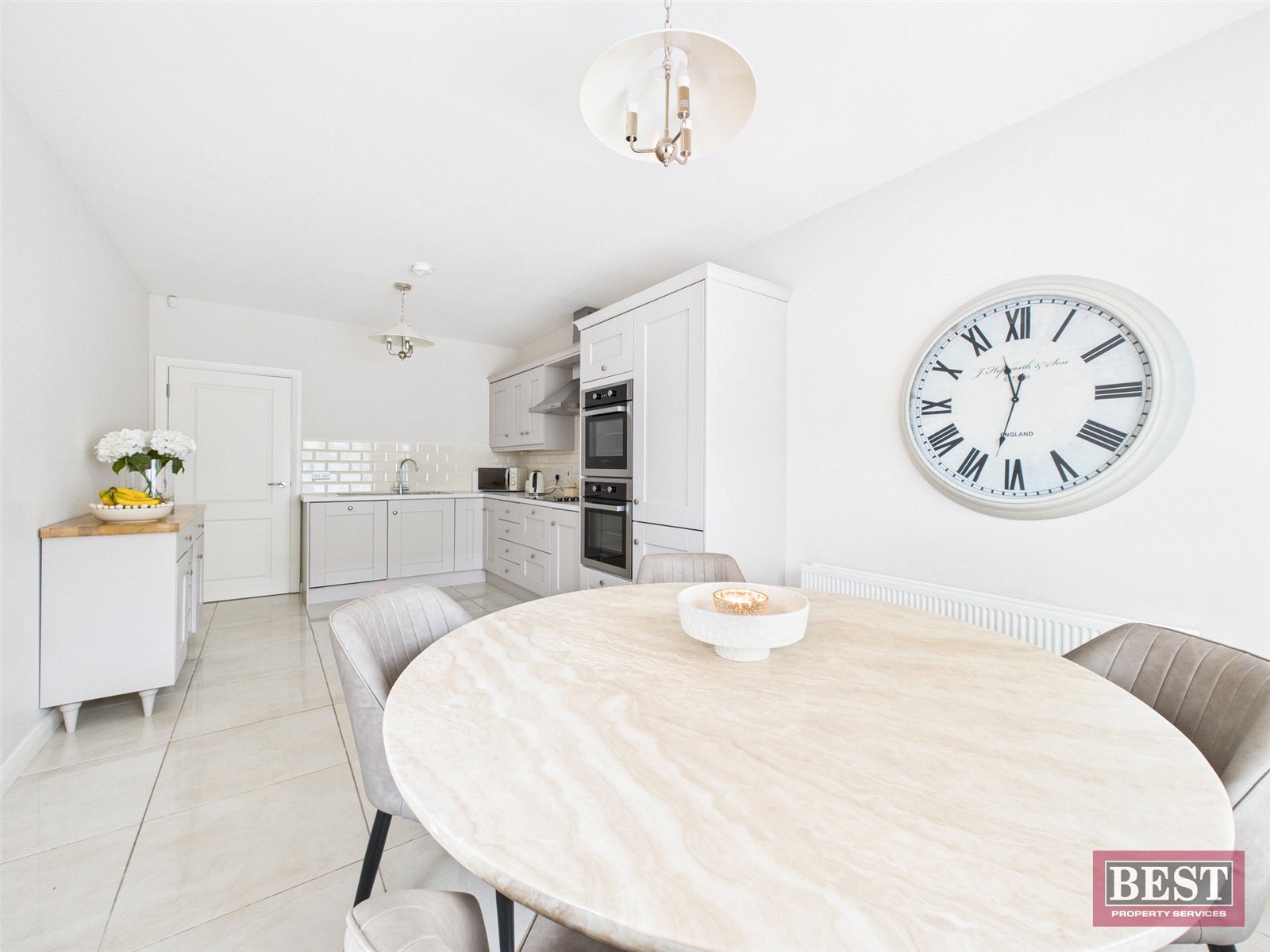 To the rear of the property is a generous kitchen/dining area, fitted with a range of modern upper and lower level units and benefiting from integrated hob, double oven and dishwasher. The space is finished with tiled flooring and partial wall tiling, making it both stylish and practical.