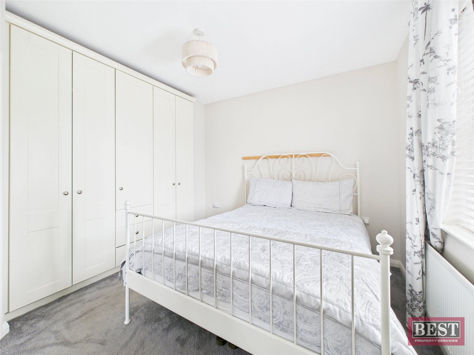 Bedroom three, front facing, benefits from carpet flooring and a bank of built-in wardrobes, and is further enhanced by an ensuite shower room with white suite including WC, wash hand basin and a separate fully tiled shower cubicle, with tiled flooring and partial wall tiling.