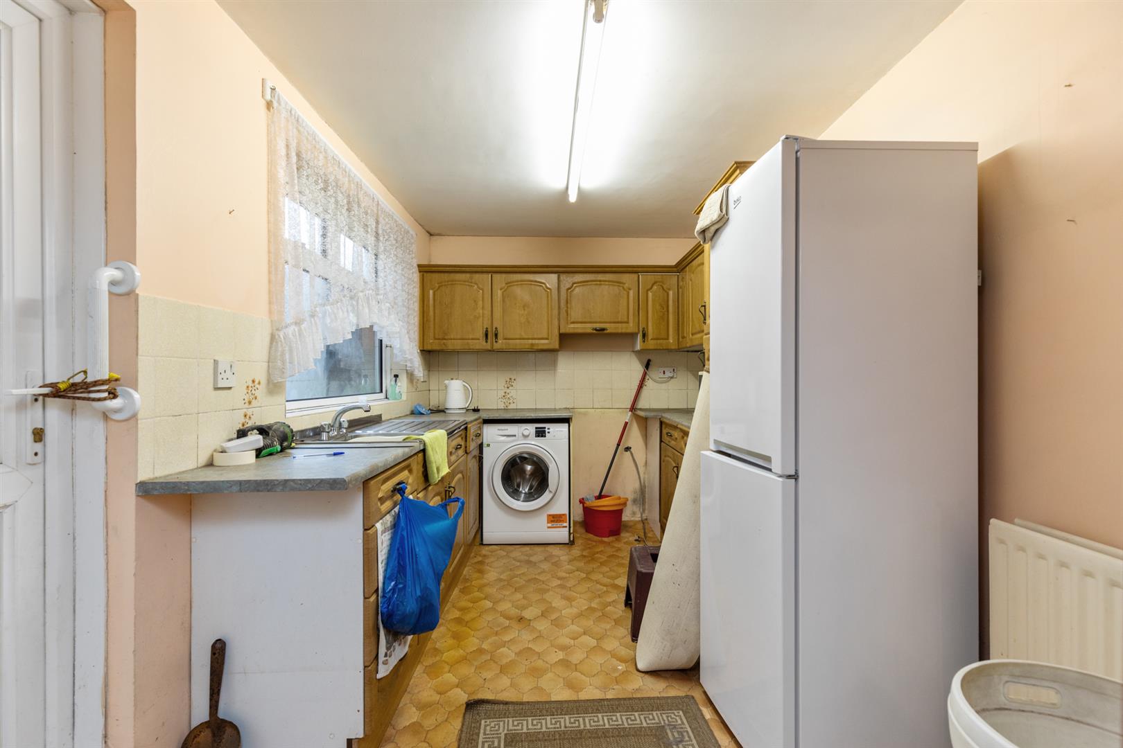 Range of high and low level units, single drainer stainless steel sink unit with mixer tap, plumbed for washing machine, part tiled walls, PVC door to rear yard.