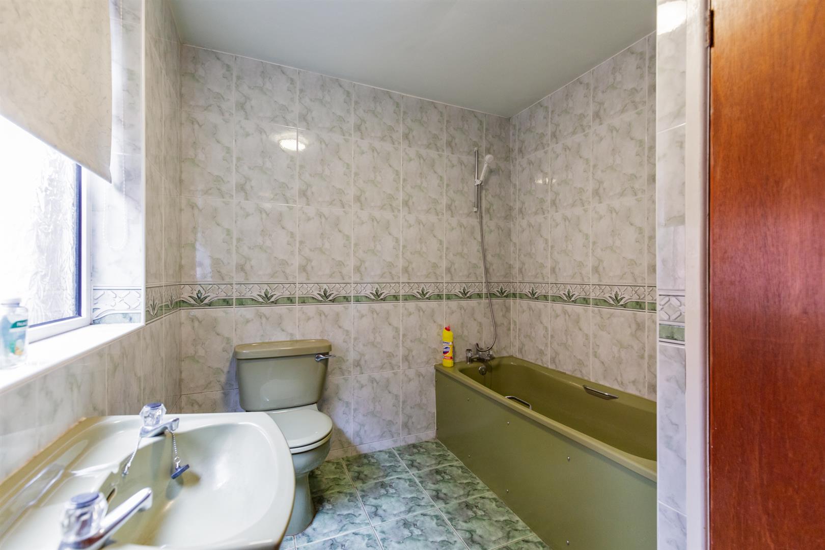 Coloured suite comprising: panelled bath, low flush WC, pedestal wash hand basin, fully tiled walls, fully tiled floor, storage cupboard housing gas fired boiler.