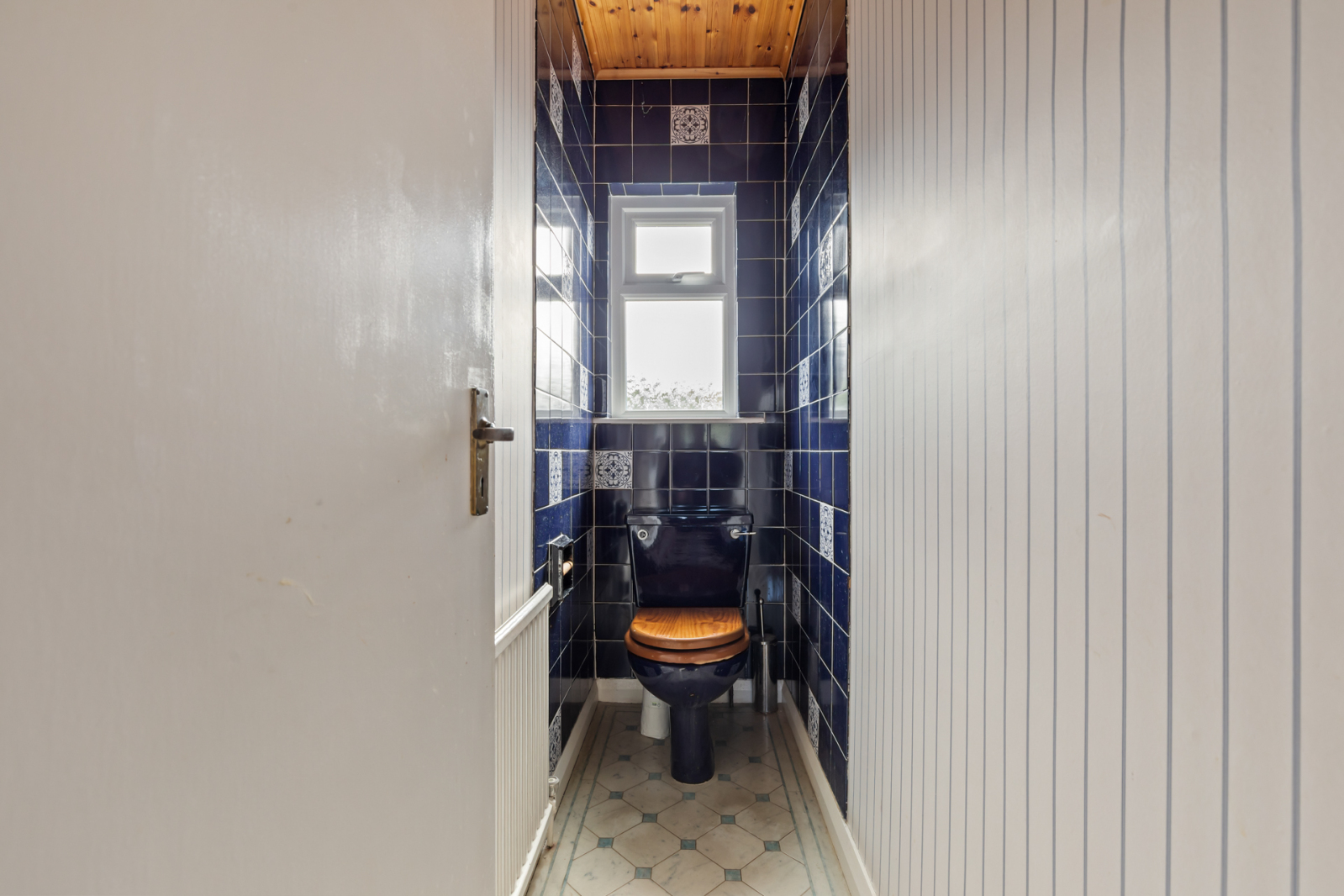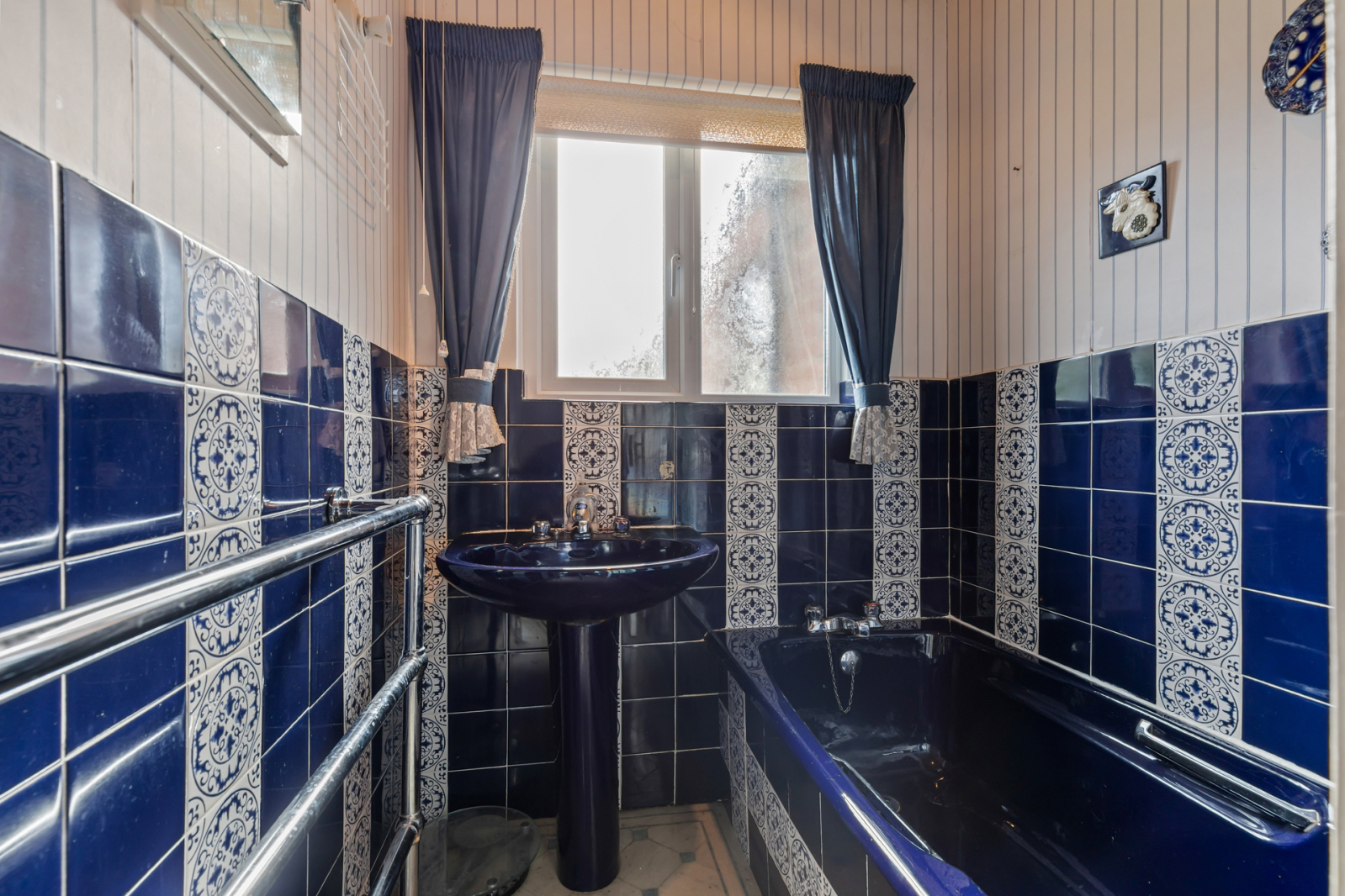 Navy blue panelled bath with mixer taps, pedestal wash hand basin with mixer taps, electric shower.