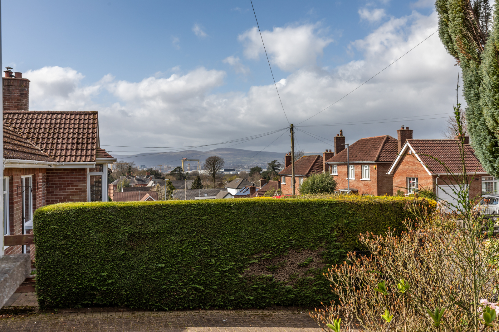 Garden in lawns and mature shrubs, driveway to side. Generous South facing rear garden in laws and mature shrubs. Path to side for access.