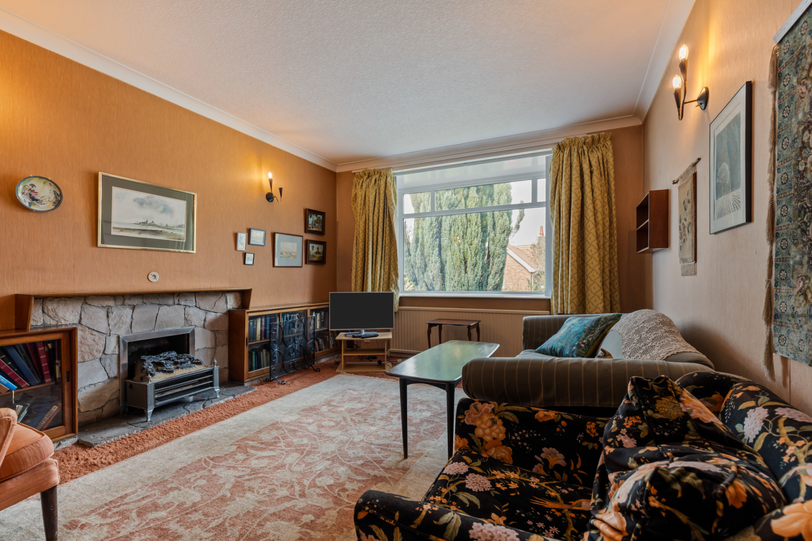 Fireplace with open fire, wired for wall lights.