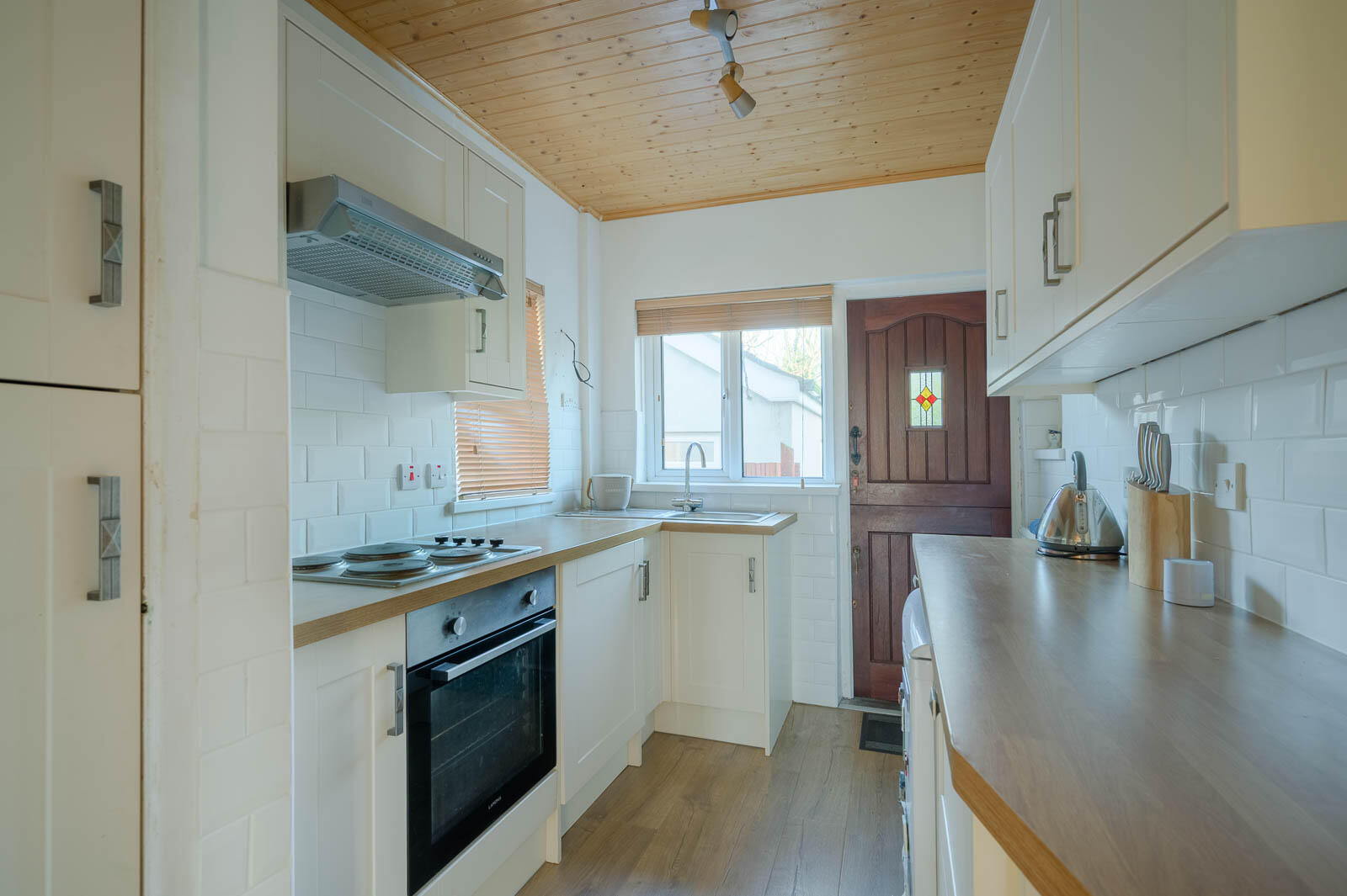 Range of Shaker style high and low level units, laminate worktop, stainless steel sink unit, integrated under oven, hob and extractor fan, integrated washing machine, under counter fridge, pine tongue and groove ceiling, stable door to rear garden, part tiled walls, wood laminate flooring.