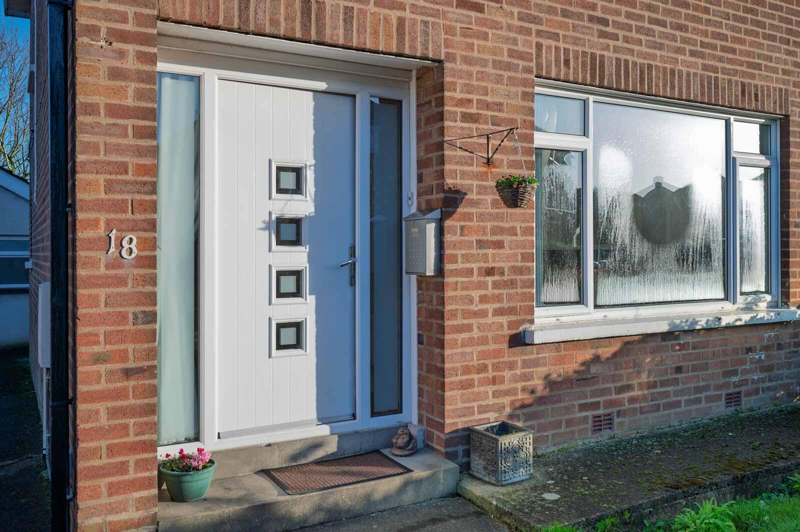 Composite front door with glazed side lights and inserts into entrance hall.