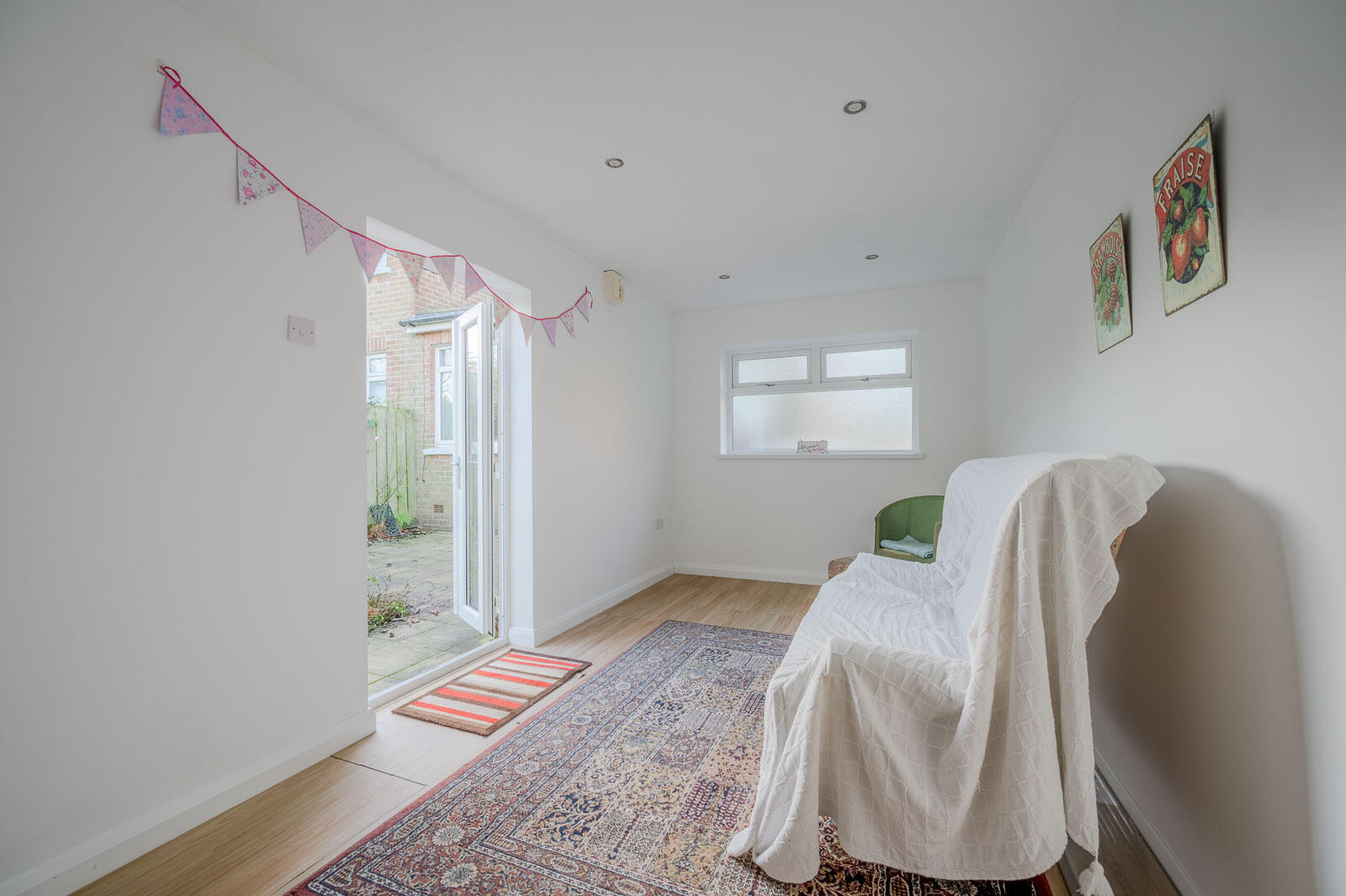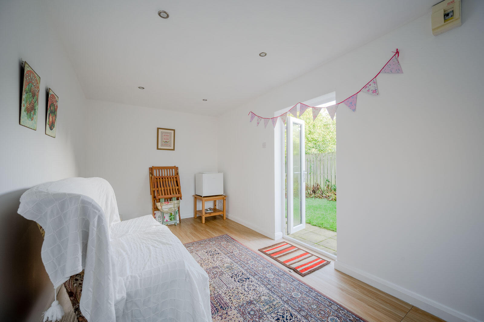 The kitchen has modern cabinetry with integrated appliances. A rear door opens directly to the garden, making outdoor dining and entertaining effortless.