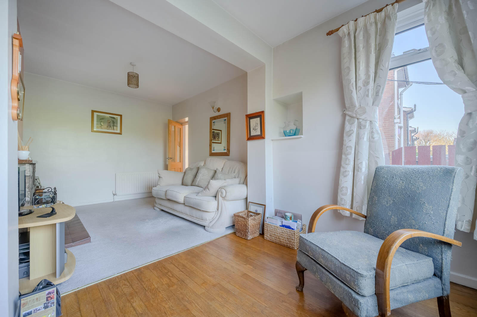 Step inside to discover a bright and welcoming interior. The home features two spacious reception rooms, each filled with natural light. The front reception room is ideal for formal dining or family gatherings, while the rear living area boasts a feature stone fireplace and a cozy atmosphere, perfect for relaxing evenings.