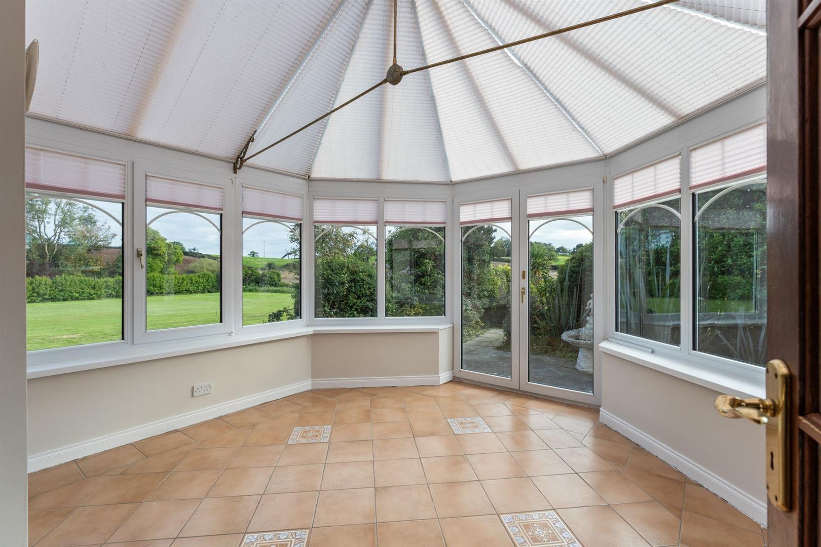 Ceramic tiled floor with tiled inset. uPVC double glazed French door to patio and gardens. Superb mature outlook to rolling countrywide. Glazed and bevelled double doors to family room and lounge.