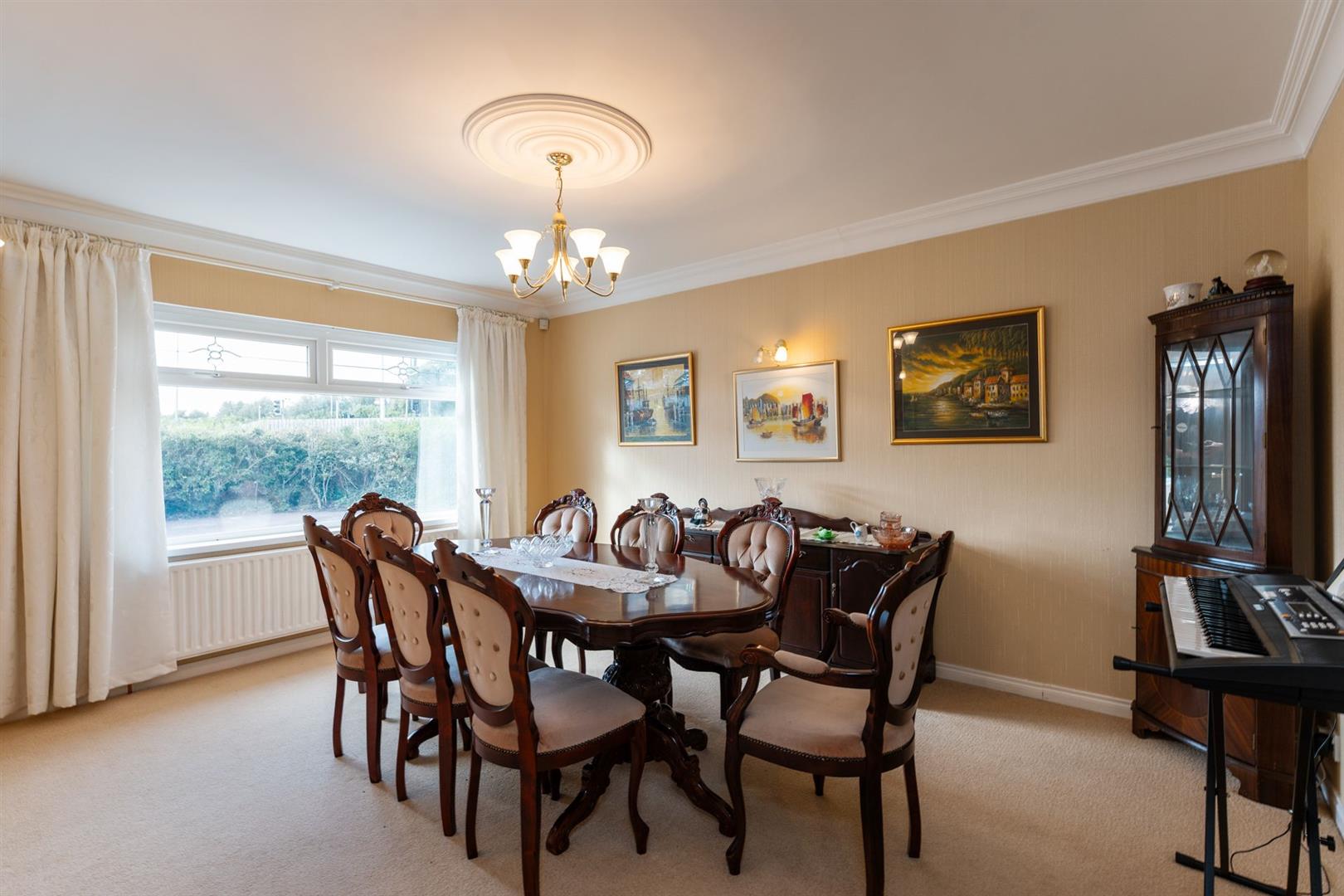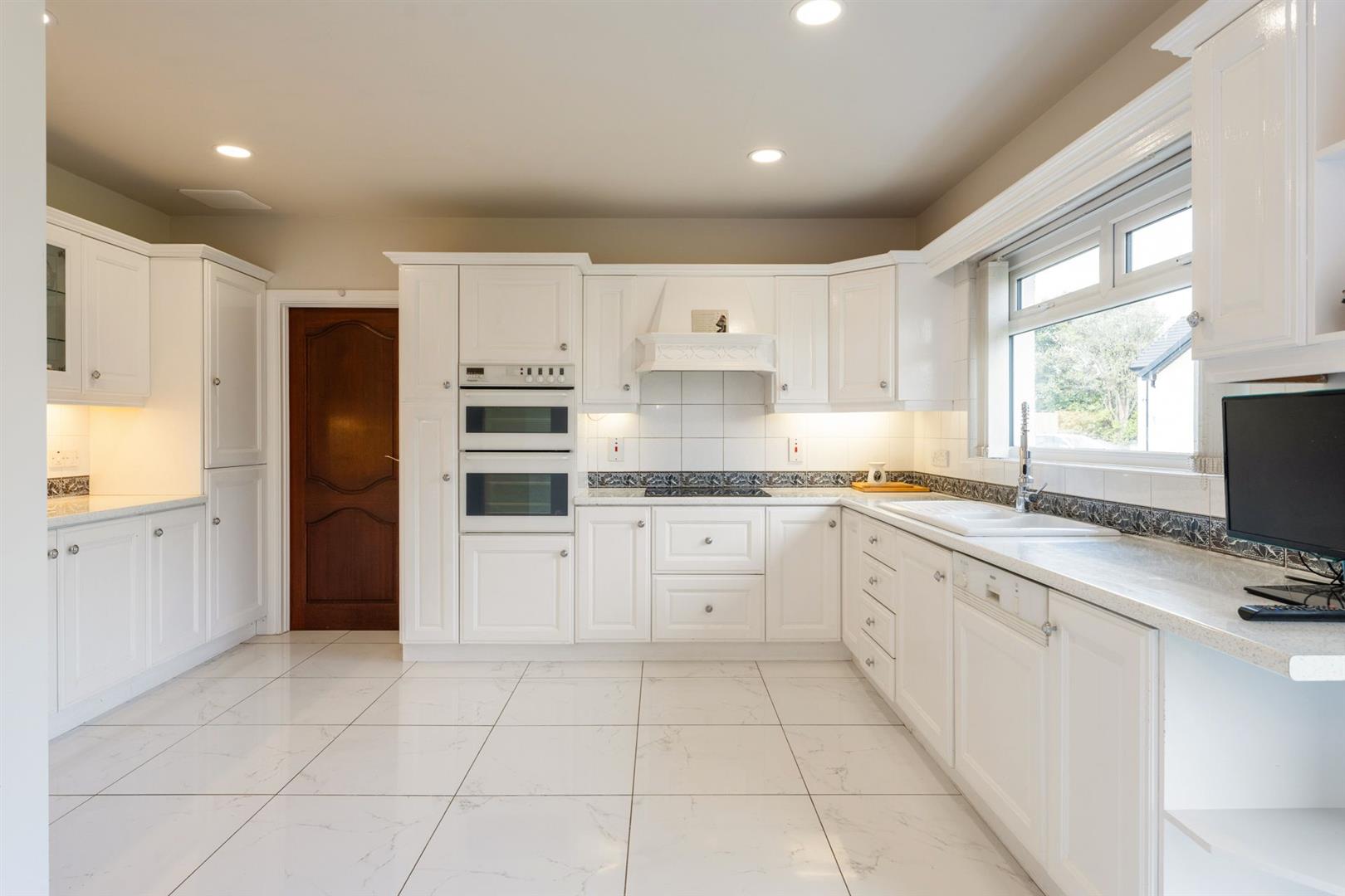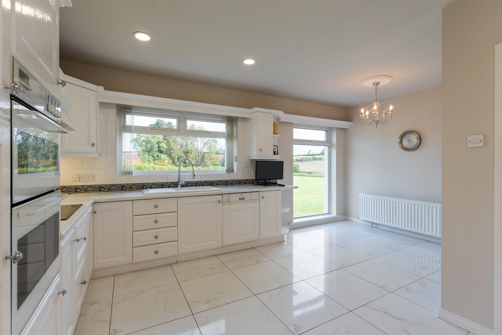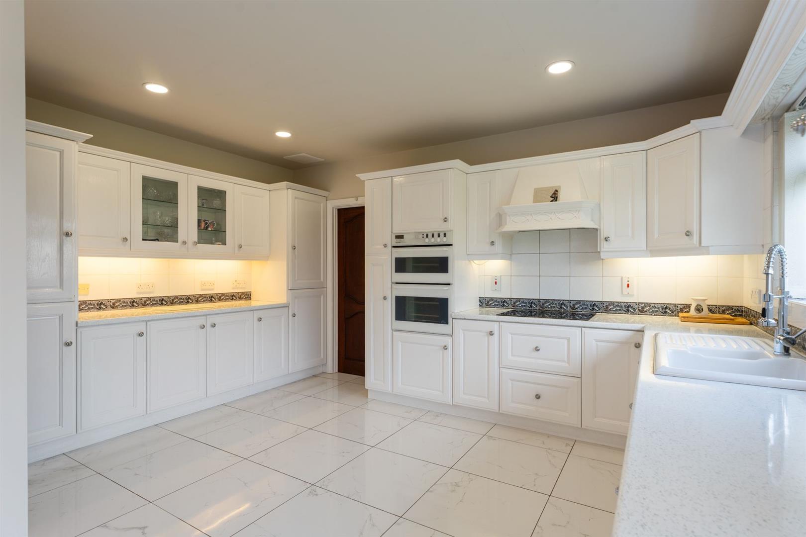 Range of hand painted high and low level oak cupboards and drawers with roll edge work surfaces. 1 1/2 single drainer ceramic sink with chrome mixer taps. Integrated Bosch dishwasher. Integrated 5 ring ceramic hob. Fitted canopy extractor hood above. Integrated high level double ovens. Pull out pantry cupboard. Integrated fridge/freezer. Built-in glazed display cabinets. Part tiled walls. Ceramic tiled floor. Ample family dining. Mature outlook to rear gardens and countryside. Access to ...