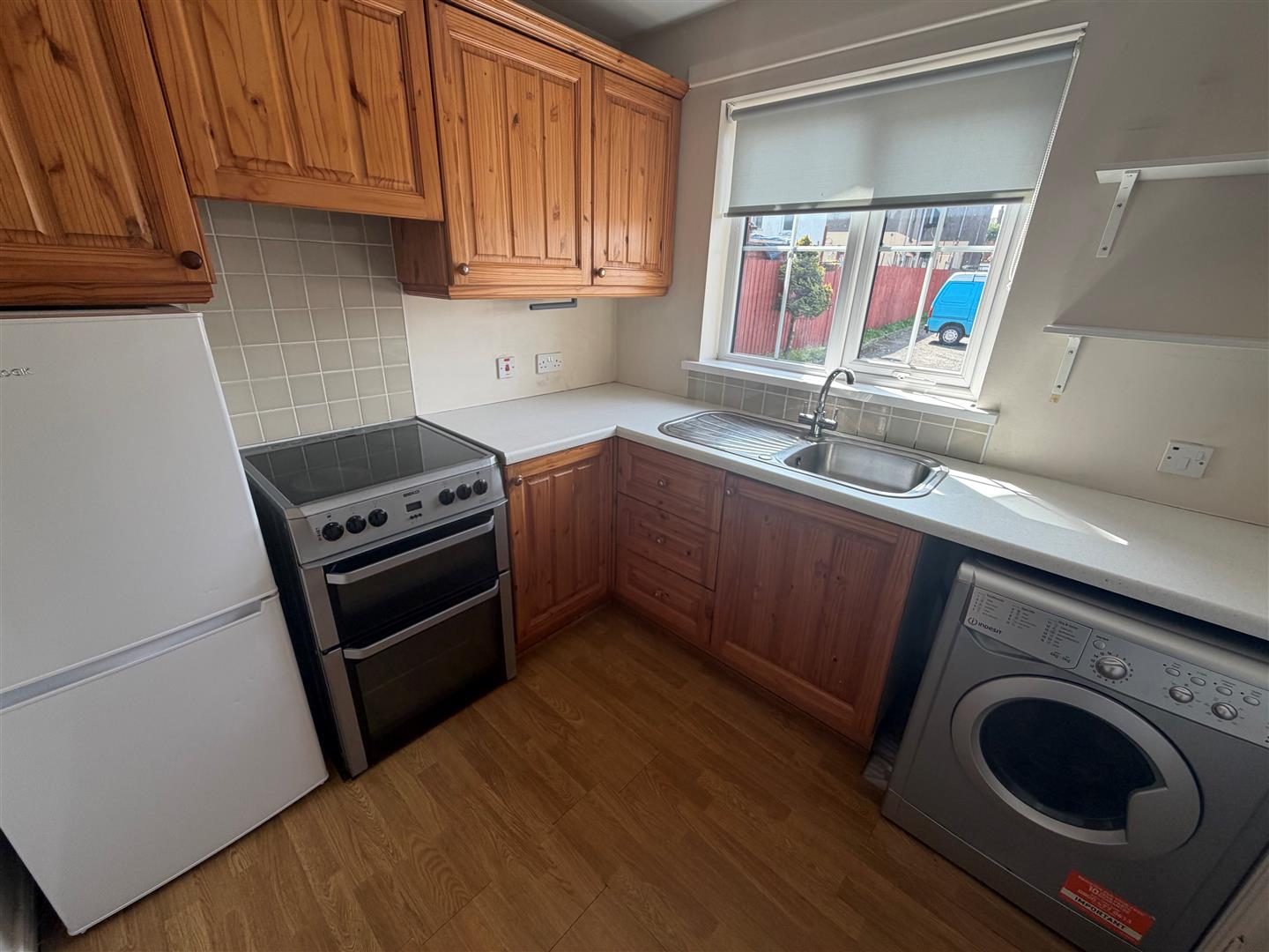 High and low level units. Stainless steel sink unit with mixer taps and tiled splash back. Extractor fan, part tiled wall below. Plumbed for washing machine. Wall mounted breakfast bar. Wooden laminate flooring. Double panel radiator. Double glazed windows.