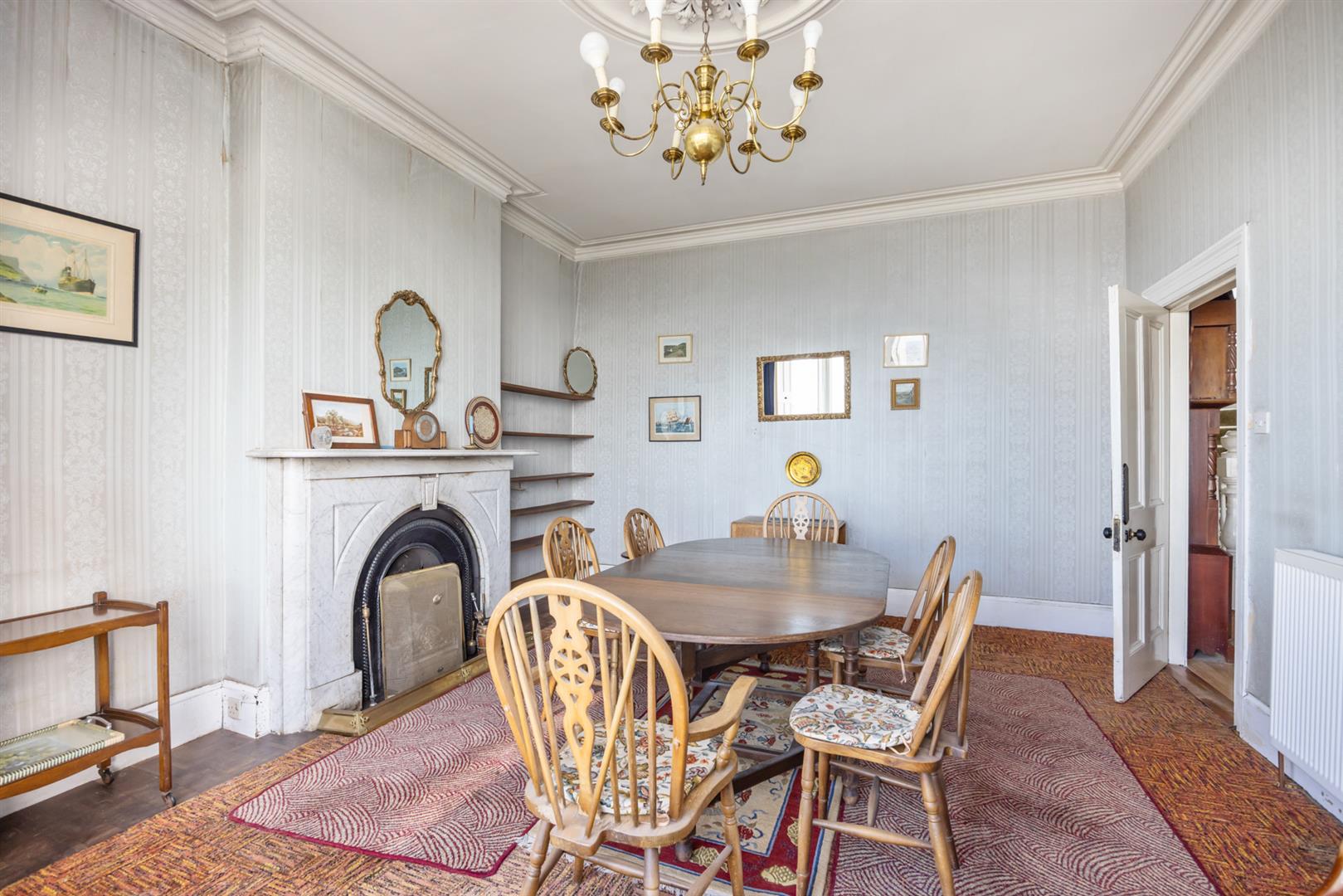 Cornice ceiling, ceiling rose, fireplace with cast iron inset and marble surround, uninterrupted sea views.