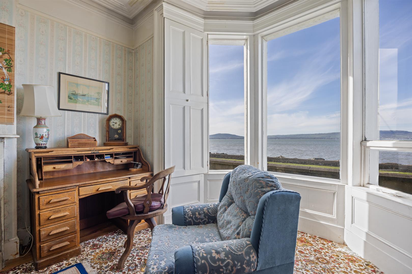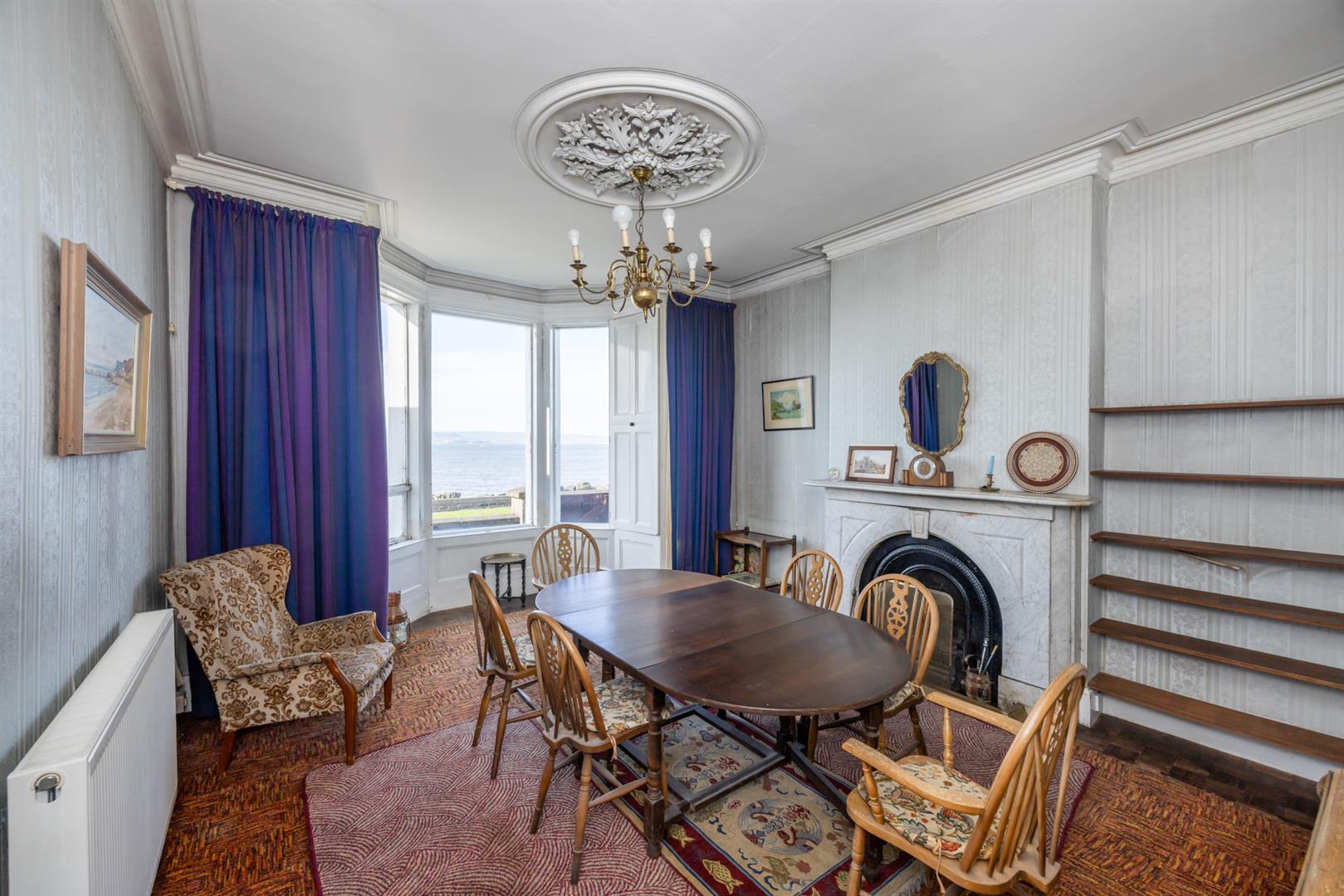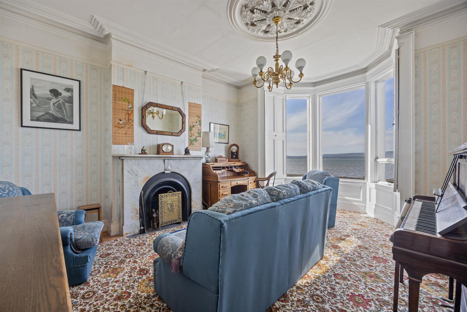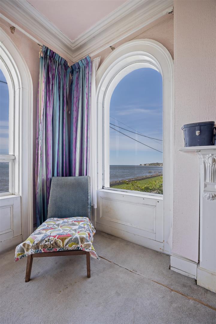 Original fireplace with cast iron inset, cornice ceiling, dual aspect windows, uninterrupted sea views.