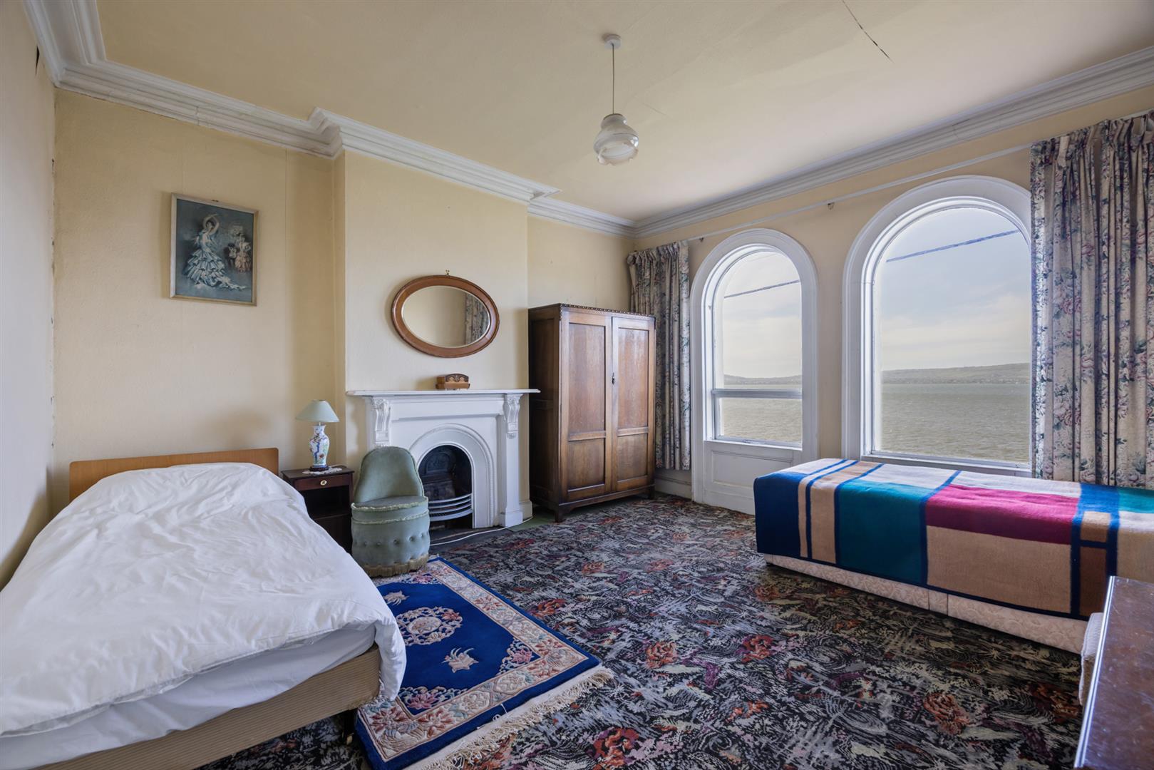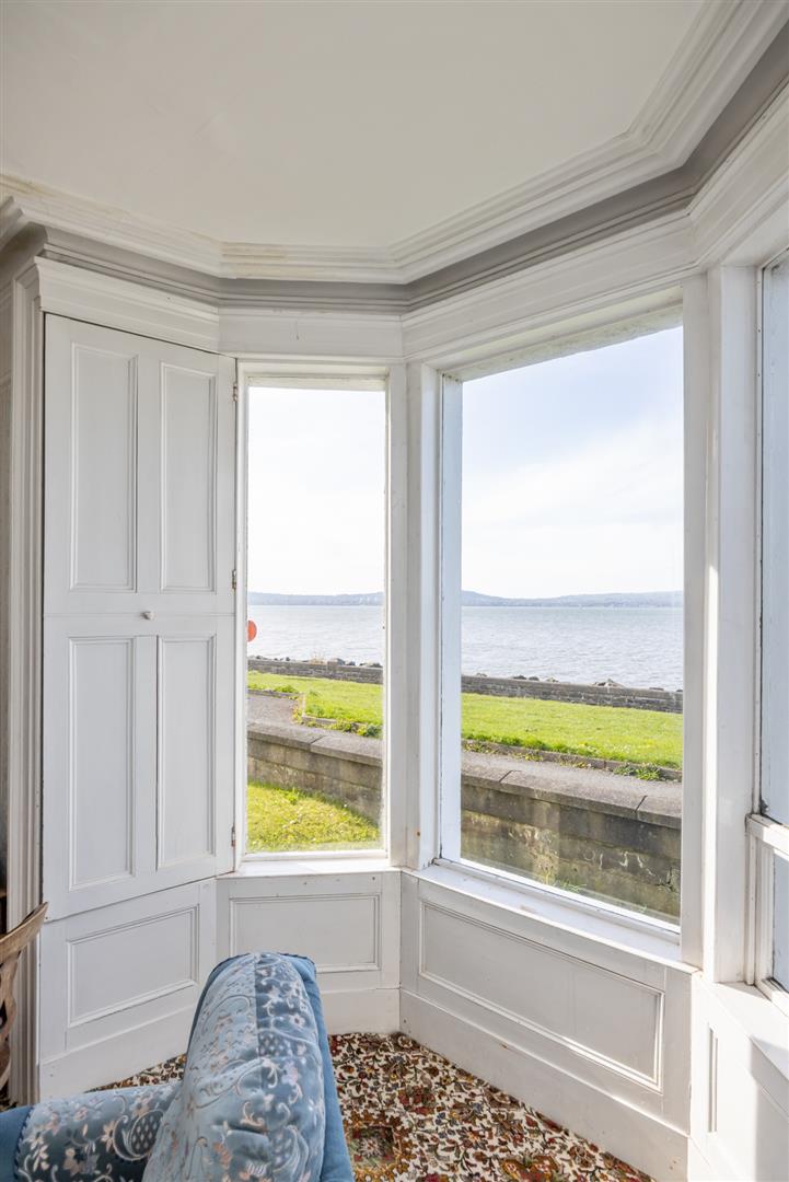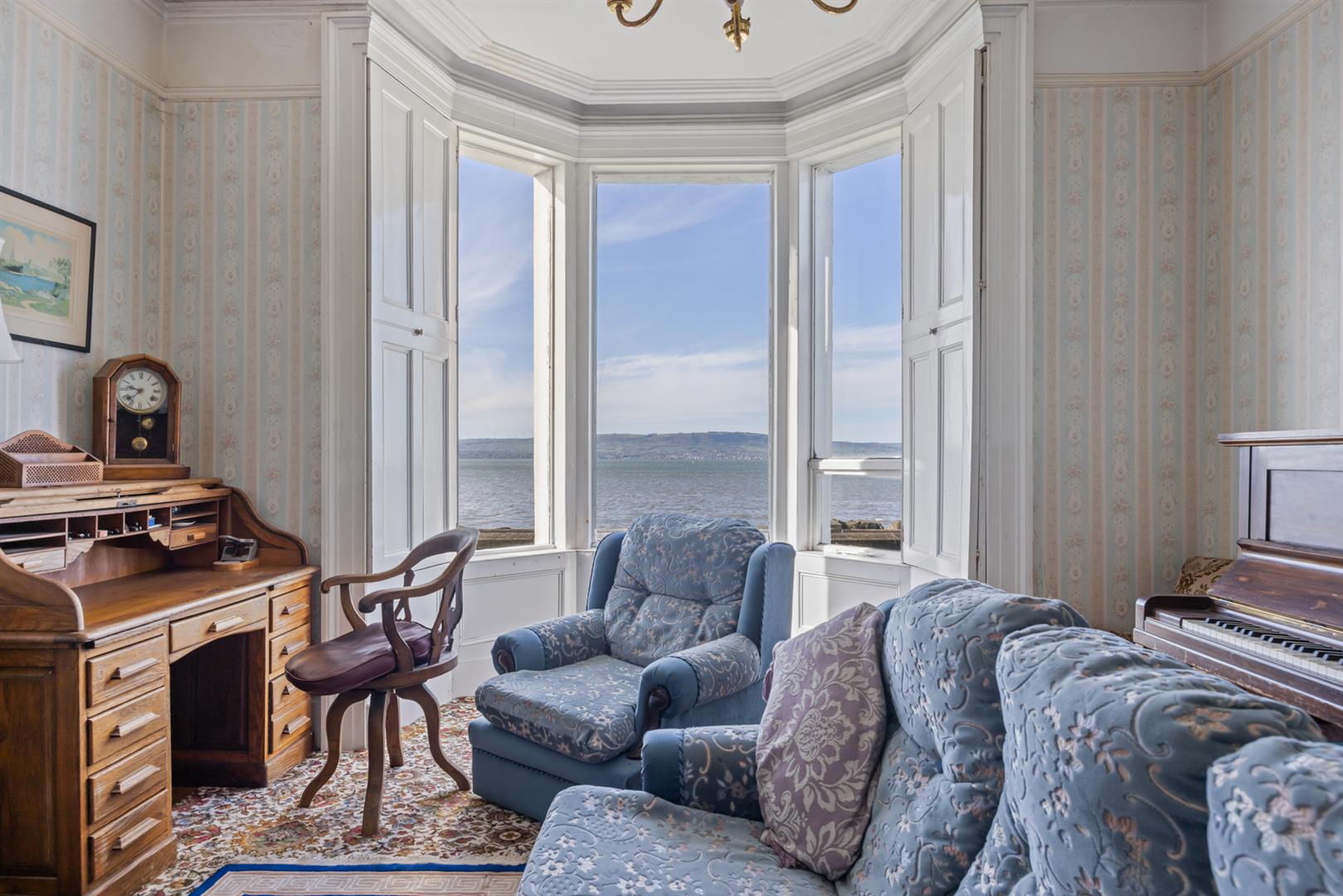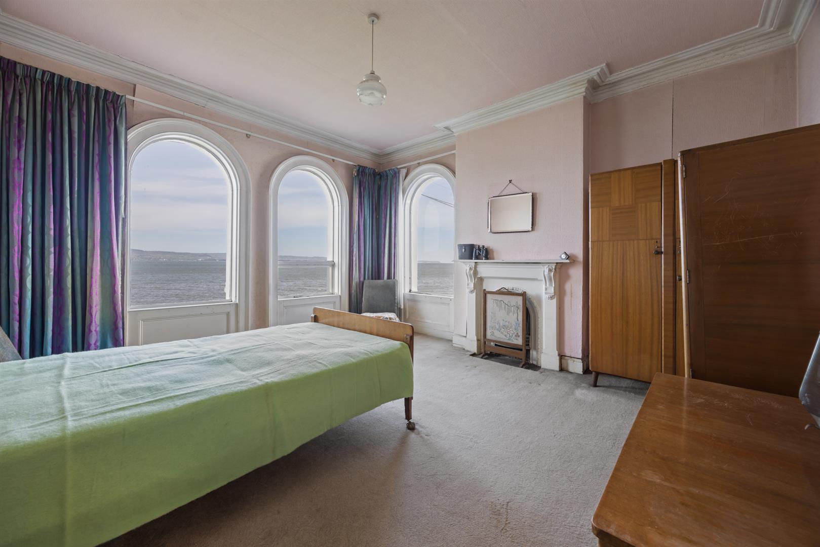 Original fireplace with cast iron inset, cornice ceiling, dual aspect windows, uninterrupted sea views.