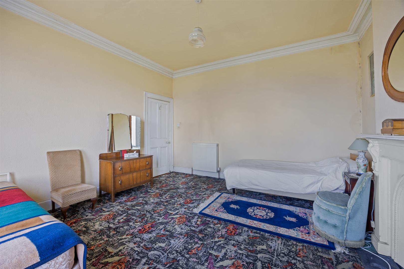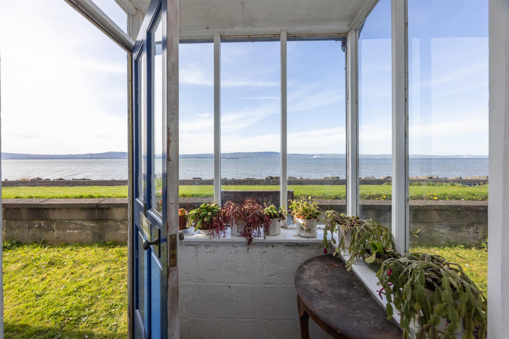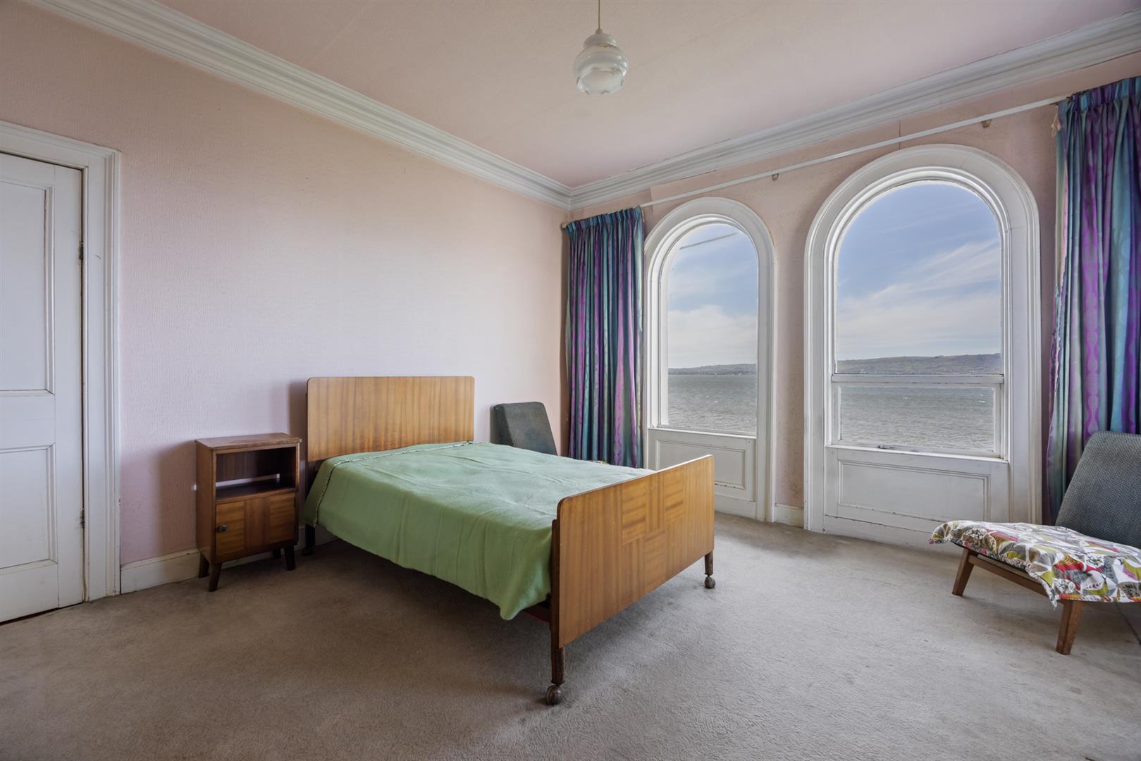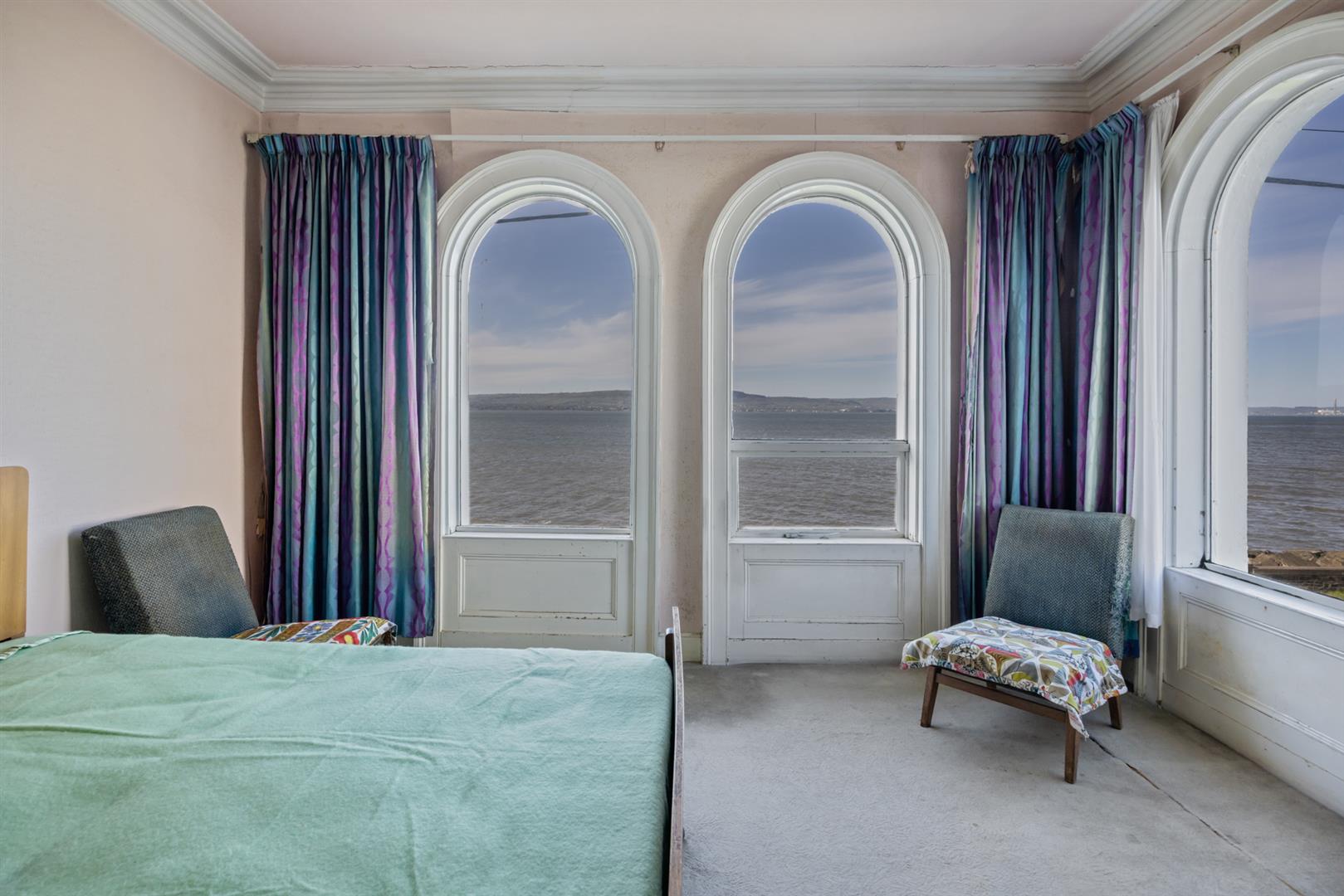 Original fireplace with cast iron inset, cornice ceiling, dual aspect windows, uninterrupted sea views.