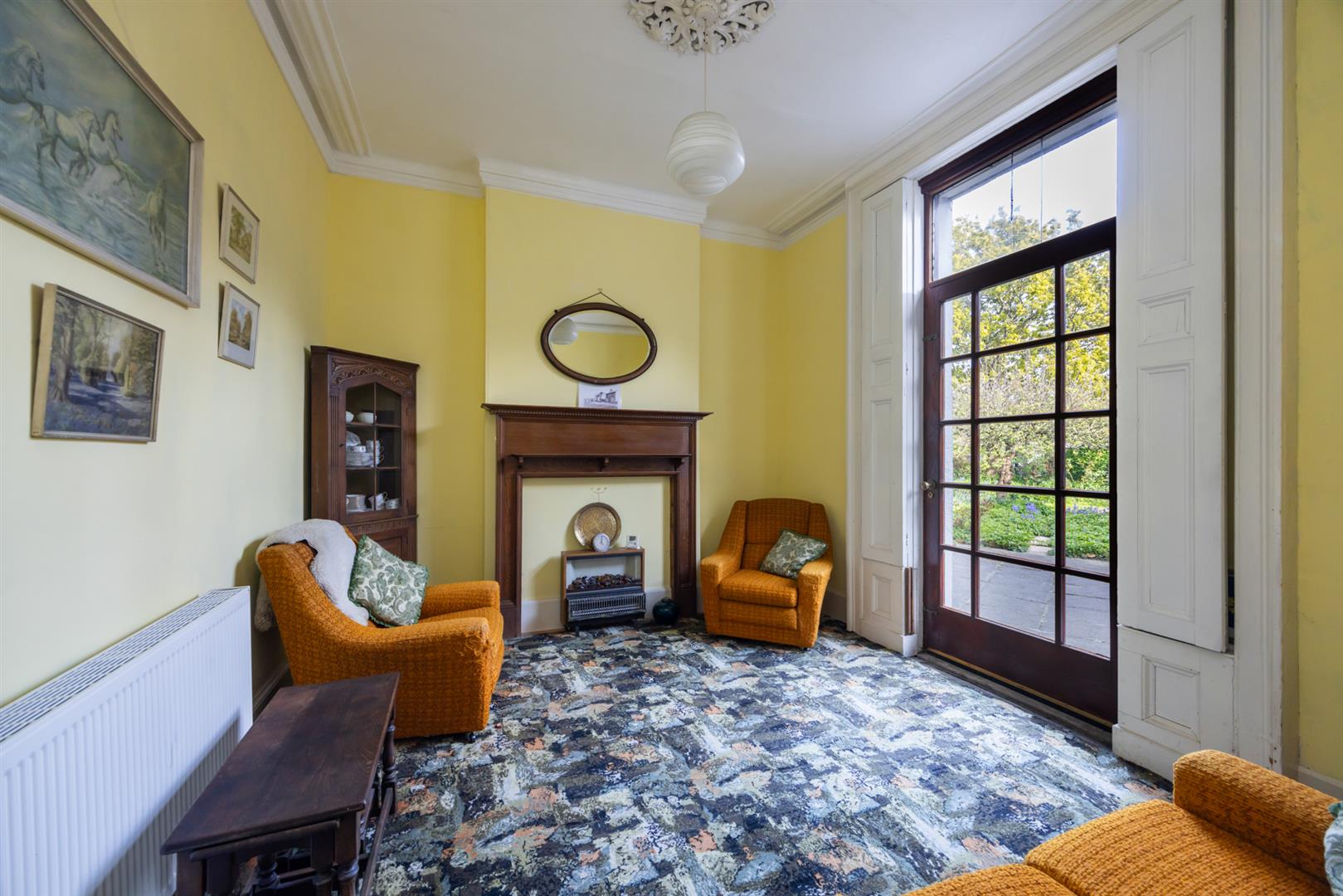 Cornice ceiling, ceiling rose, fireplace with carved mahogany surround, glazed door to rear garden.